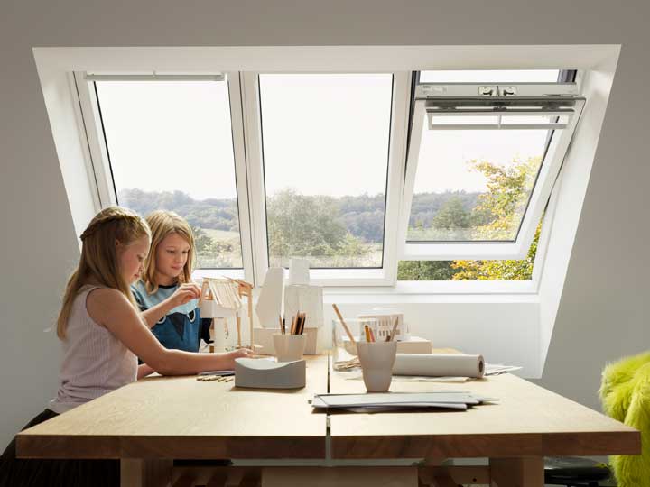 Door de slanke kozijnen komt er door het VELUX STUDIO ‘3-in-1’ dakraam wel 23% meer natuurlijk licht binnen dan bij drie los naast elkaar geplaatste dakramen met dezelfde afmetingen. Door het extra gevoel van comfort, welzijn en ruimtelijkheid dat deze combinatie van dakramen creëert, geniet je nog meer van je tijd in huis. Het is een perfecte oplossing voor in de uitbouw van je woonkamer en andere ruimtes waar veel daglicht en frisse lucht belangrijk zijn, zoals werkkamers, kinderspeelkamers en slaapkamers. Plaats het dakraam boven een eettafel en kijk naar de wolken terwijl je eet of zet de bank in de woonkamer onder het dakraam, zodat je naar de sterren kijkend geniet van welverdiende ontspanning.