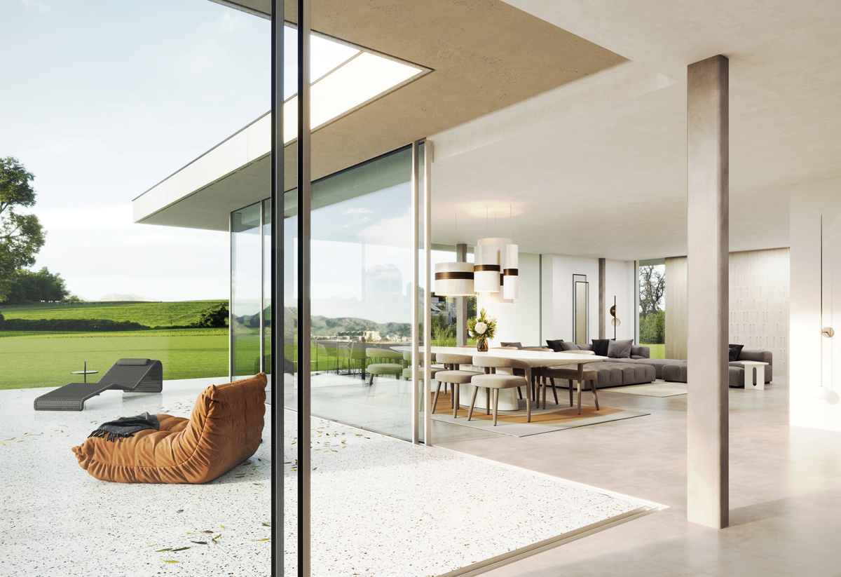 De open hoek oplossing geeft een ruimtelijke verbinding tussen binnen en buiten. Een ononderbroken uitzicht om van te genieten. Bovendien heeft dit schuifraam een vlakke dorpel waarbij de vloer binnen en buiten op dezelfde hoogte liggen, zonder overstapje. Niet alleen heel mooi, maar ook rolstoelvriendelijk.