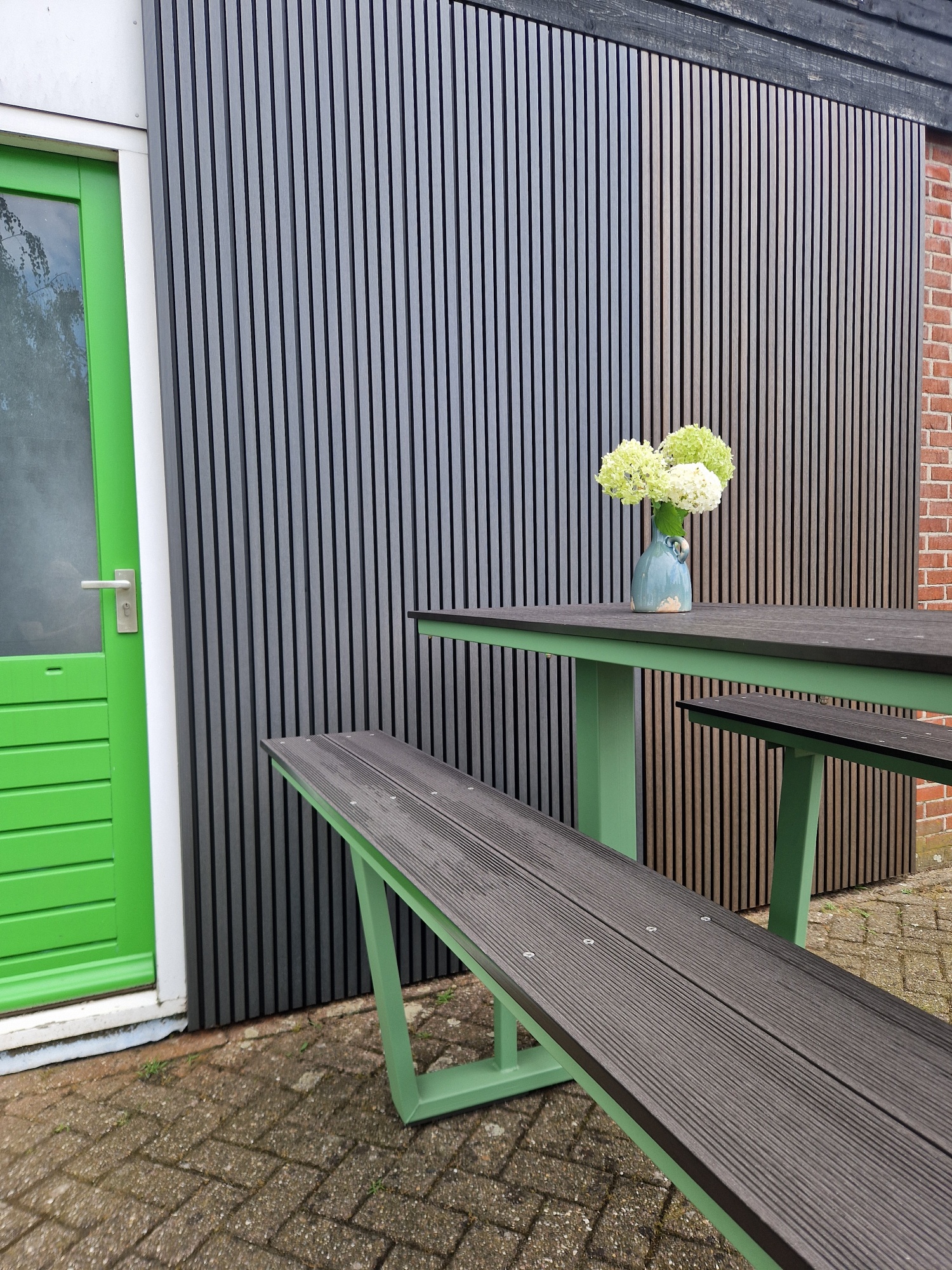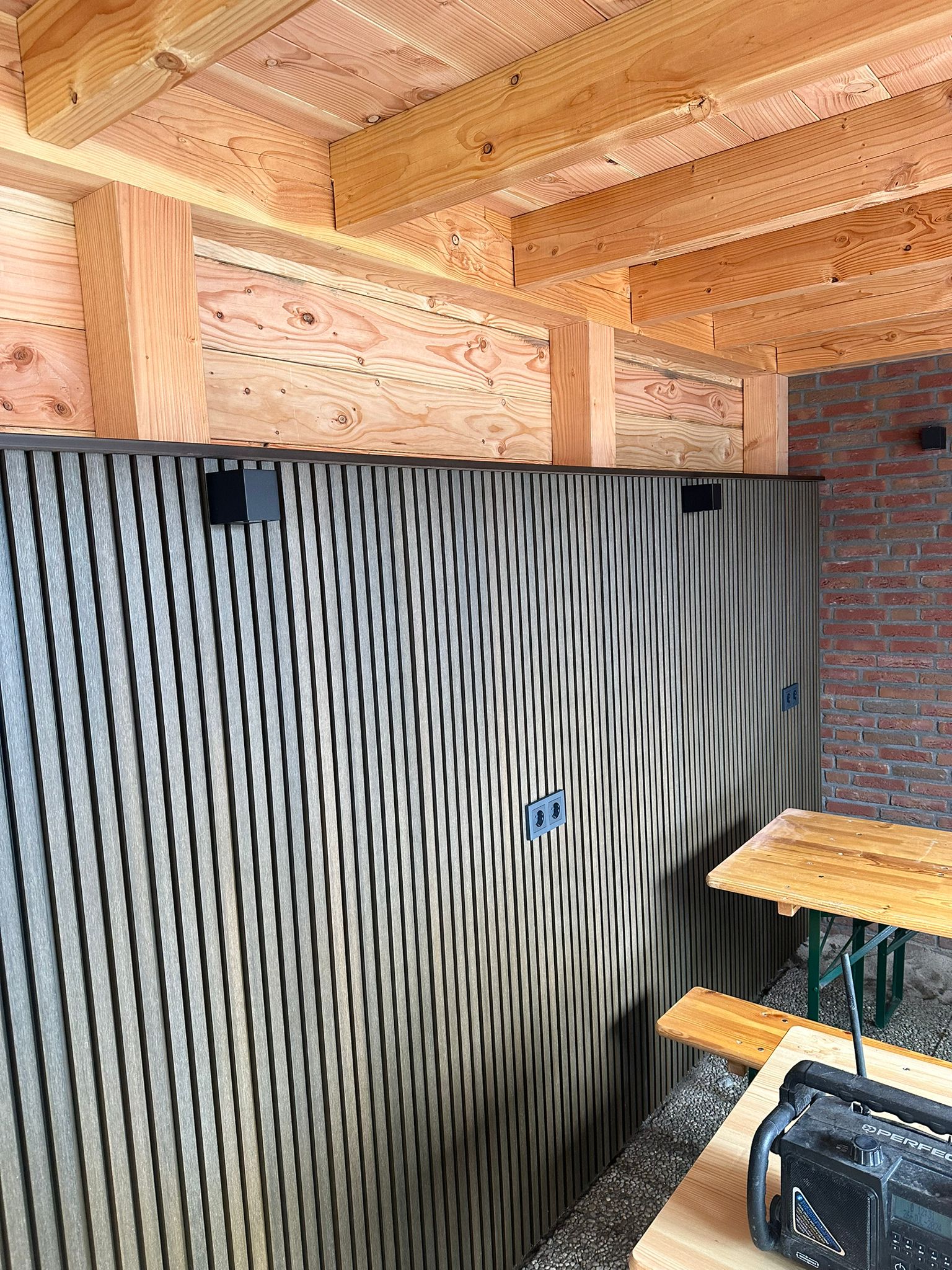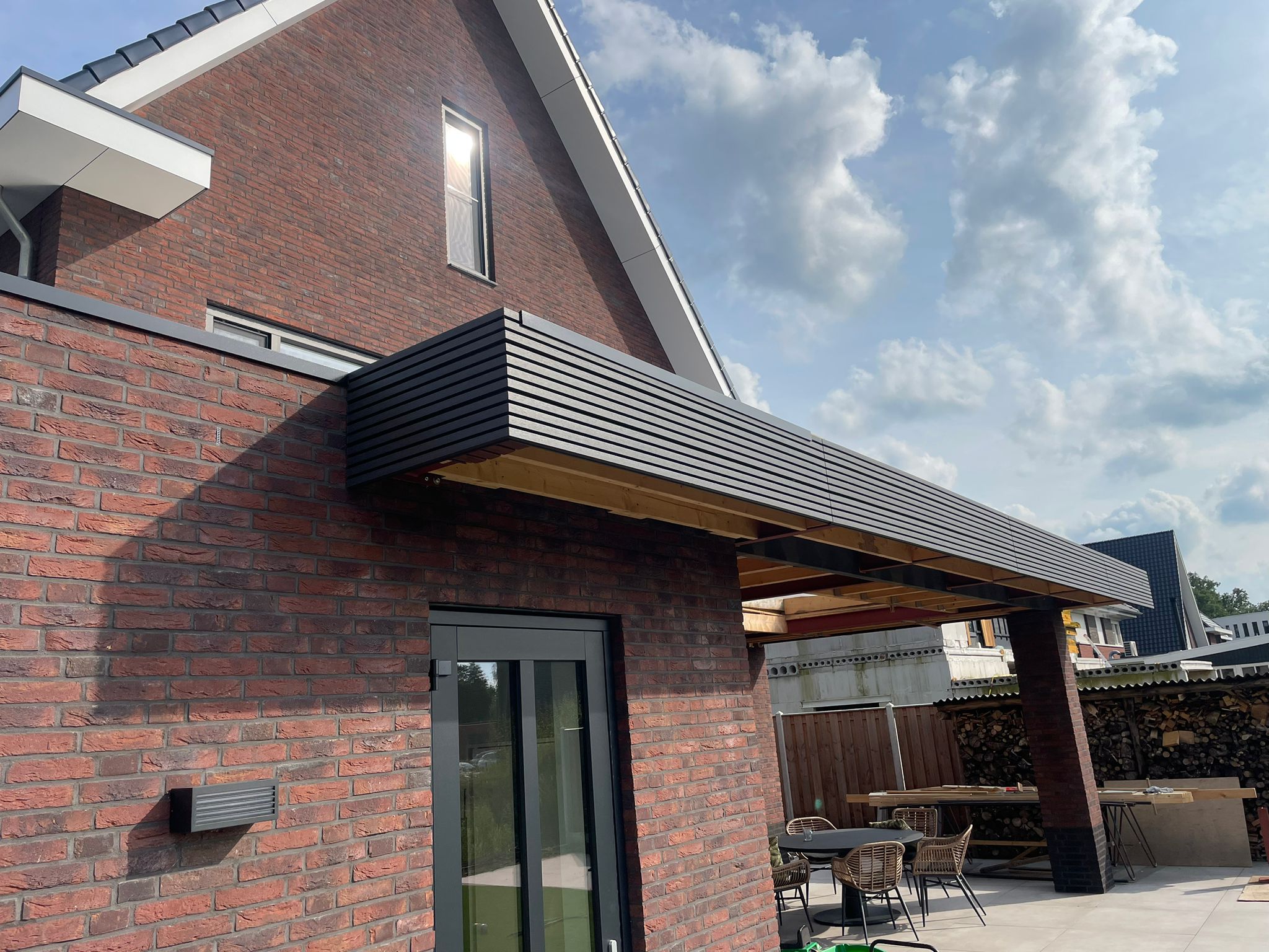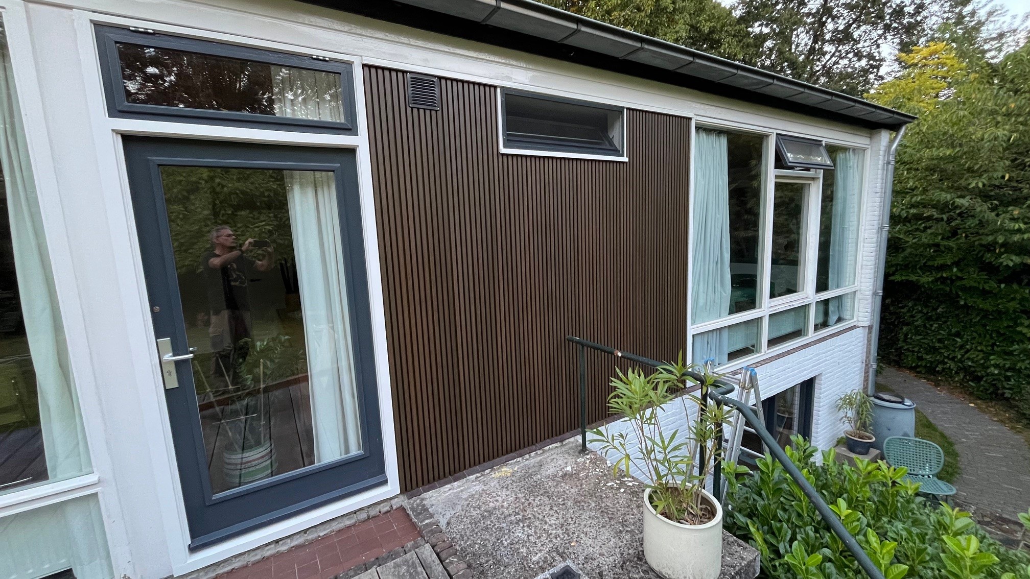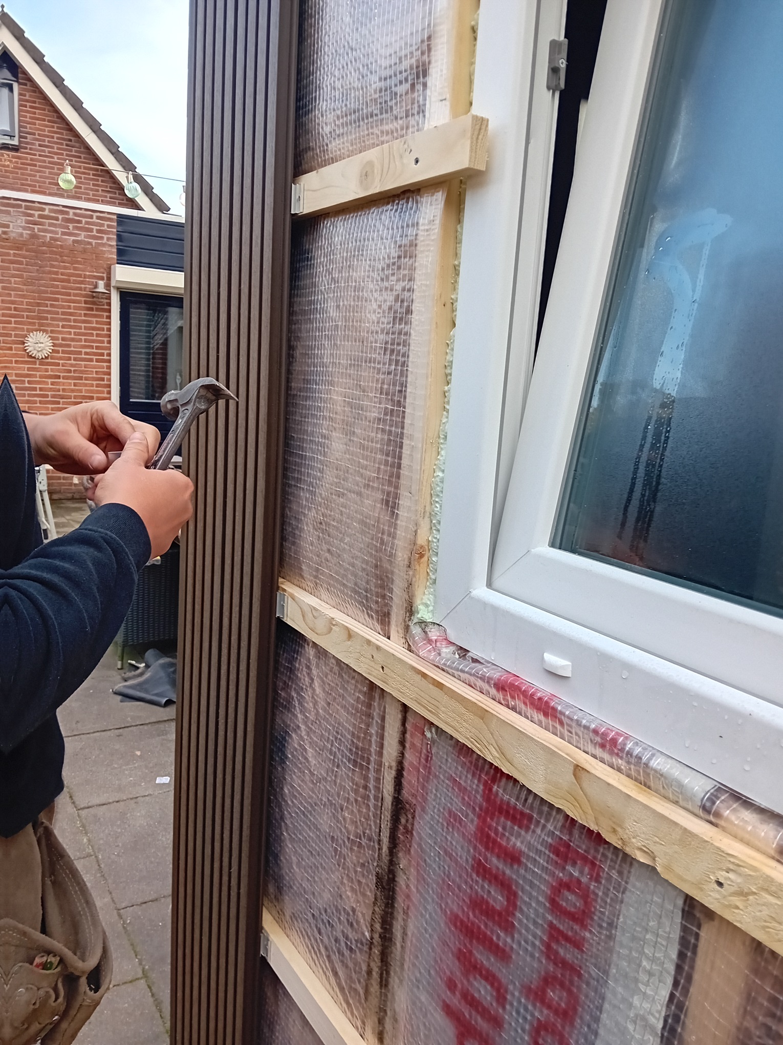Onze massieve composiet regels zijn 3 x 4 cm met een lengte van 290 cm. Het kan natuurlijk ook op panlatten oid geschroefd worden.
