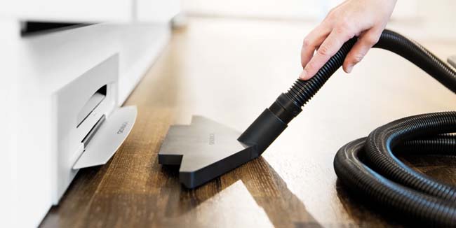 Met behulp van de meegeleverde afstandsbediening wordt de klep van de plintstofzuiger geopend. Resten van muesli, stof en andere kruimels worden voor de klep geveegd en daar met kracht opgezogen en in een gemakkelijk te vervangen zak opgevangen. Bovendien kan ook zeer eenvoudig een mondstuk met slang worden aangesloten op de plintstofzuiger. Zodat ook op het werkblad of op stoelen en in laden of uittrekelementen snel en efficiënt kan worden gezogen.