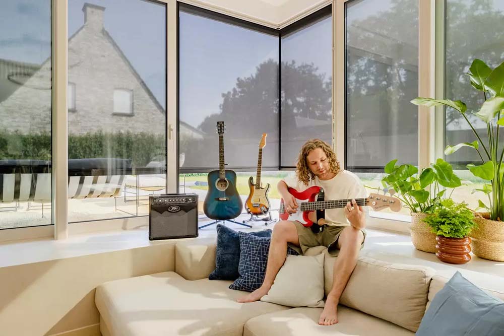 “We stripten de bestaande woning tot enkel het bouwkundige frame overbleef,” blikt Kees terug op de totaalrenovatie van z’n woning, “om het dan van onder tot boven volledig in te pakken met isolatie zodat we het op het vlak van energie efficiëntie weer up-to-date zouden krijgen. Tegen de gevel op het gelijkvloers kwam die isolatie aan de buitenkant van de bestaande muren. De aluminium, verticale Linarte-gevelbekleding van Renson bleek vervolgens een schot in de roos om die geïsoleerde gevels fraai mee af te werken. Zeker omdat die van deze verbouwing 1 geheel maakte, zonder dat de bestaande woning nog van de nieuw aangebouwde delen te onderscheiden valt. Wie onze woning nu ziet, ziet een gebouw in balans en kan nauwelijks geloven dat het om een verbouwing gaat.”