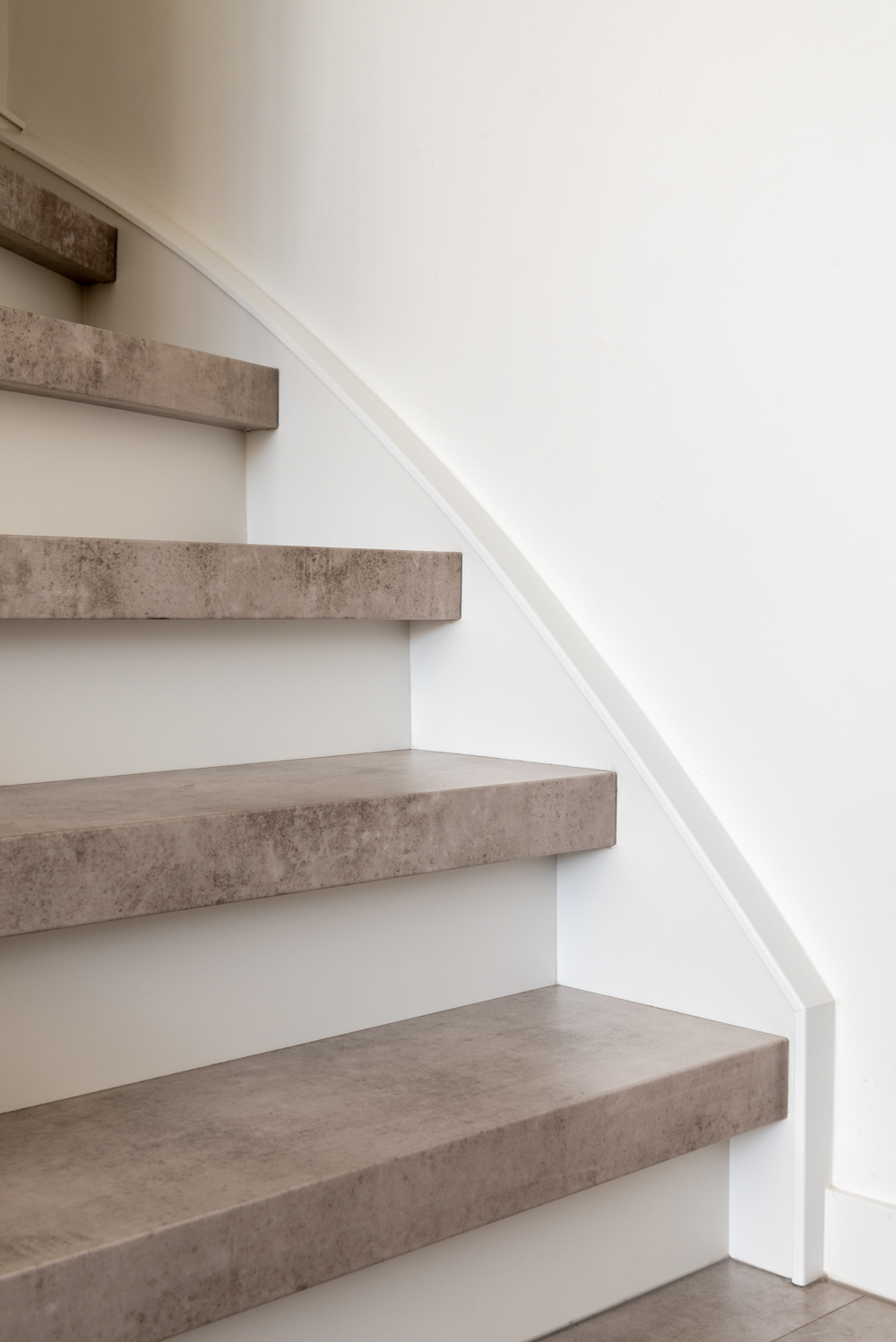 PVC trapbekleding en vloer met de beste kwaliteit van Tarkett, in een prachtige betonlook. De vloer loopt prachtig door in de trap en je krijgt hiermee een fantastische entree. De pvc toplaag is stil, sterk en gemakkelijk met vochtige doek te reinigen. Vraag de vakman !