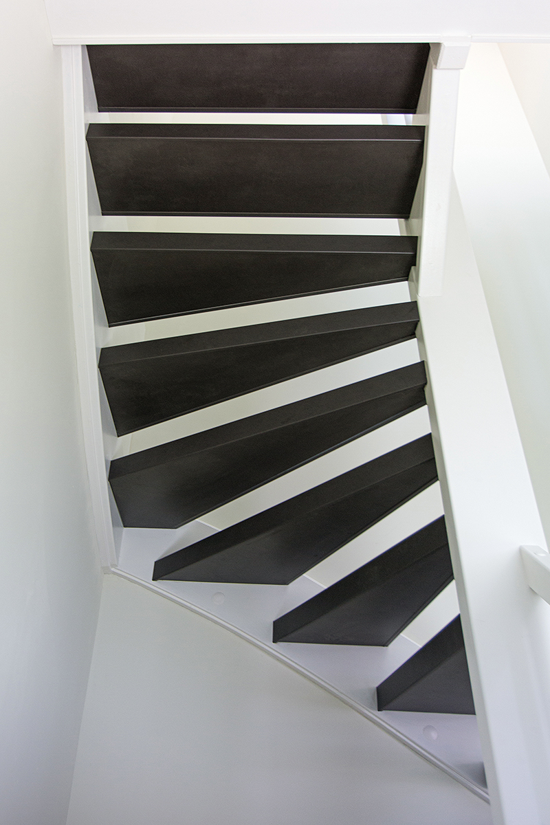 Bij het enkelzijdig bekleden van de trap, wordt aan de bovenkant van de treden gerenoveerd. De bovenkant is ook het meest slijtagegevoelig. De onderkant van de treden blijft dan zoals hij is. Om ook de onderkant van de trap een nieuwe en frisse uitstraling te geven, is schilderen een van de mogelijkheden. Zo ziet de enkelvoudig bekleedde open trap er weer helemaal als nieuw uit.