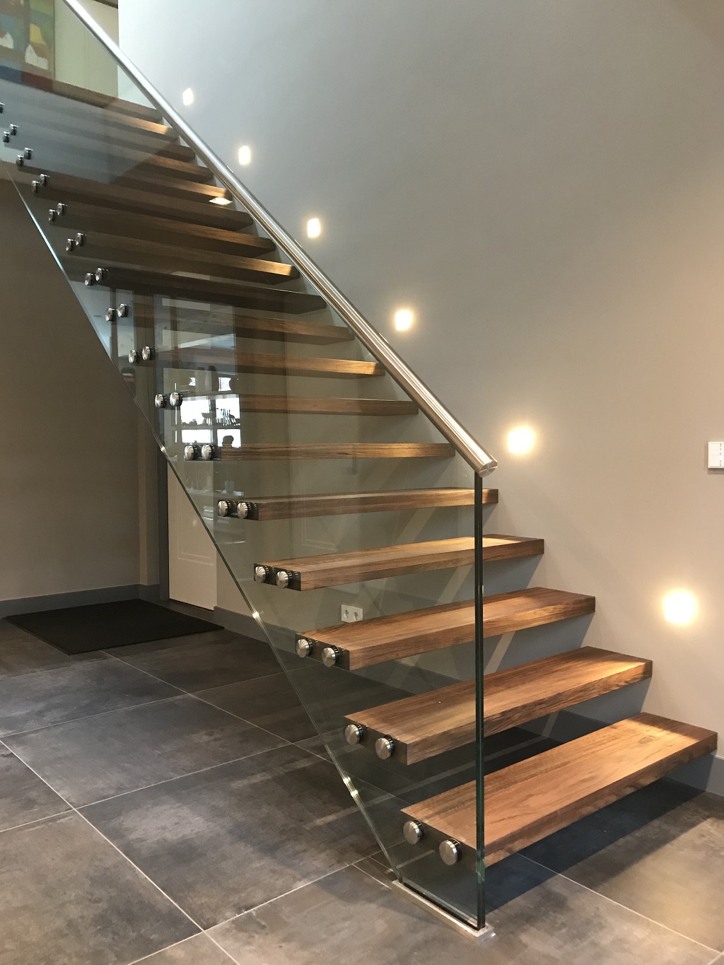De houten treden zijn zwevend bevestigd tussen muur en glazen trapboom. De glazen panelen zijn afgewerkt met een RVS leuning op het glas.