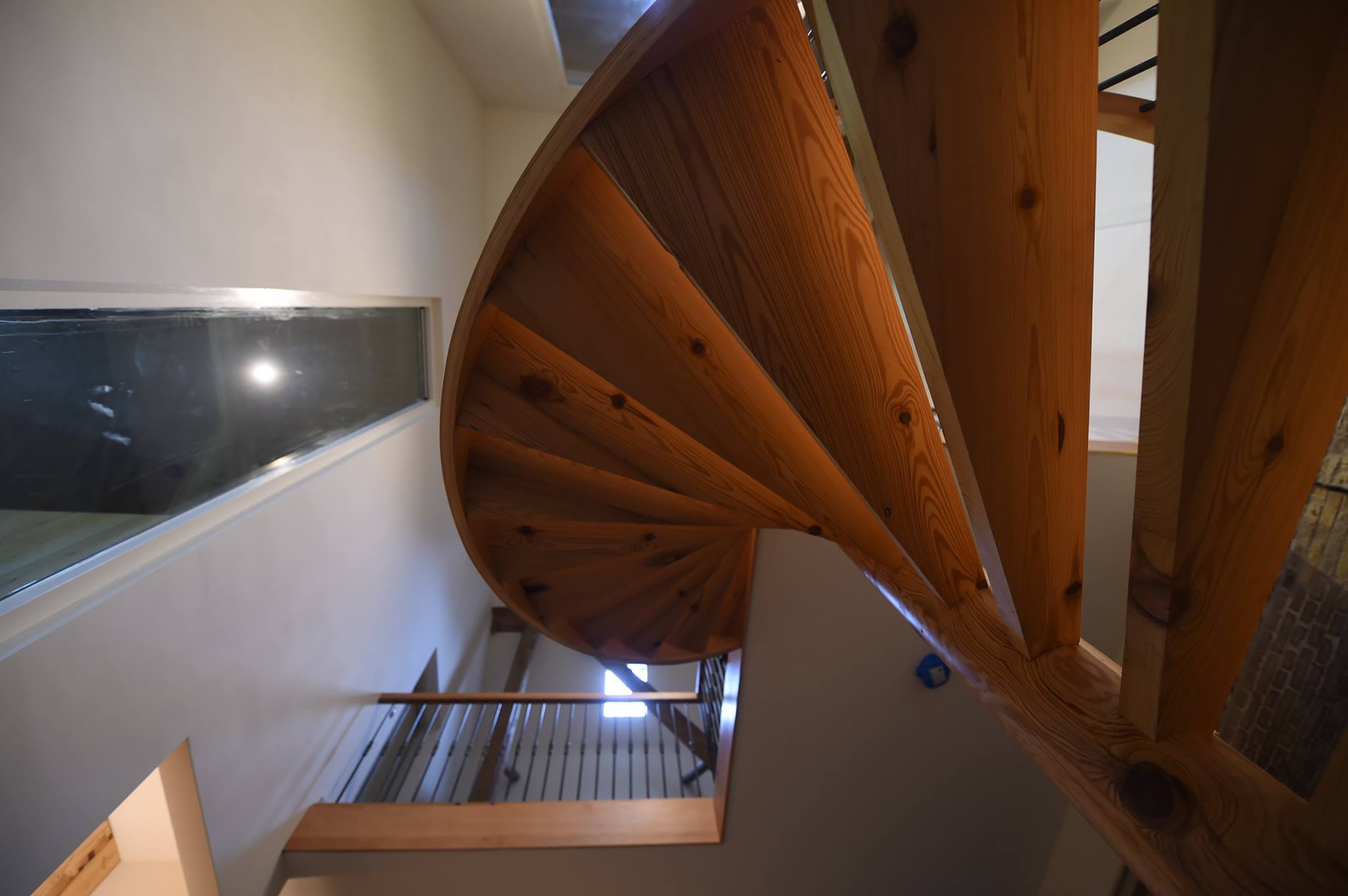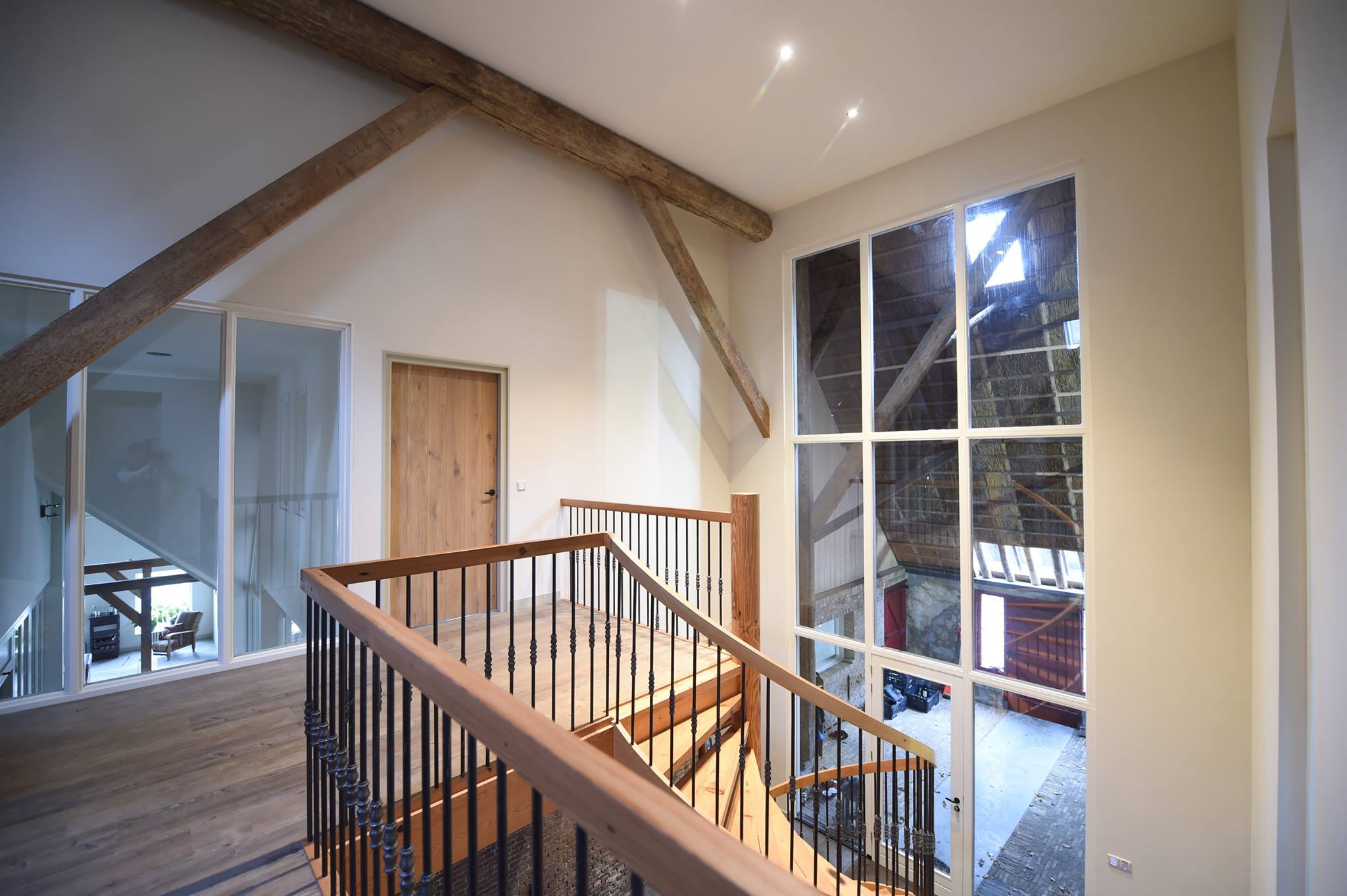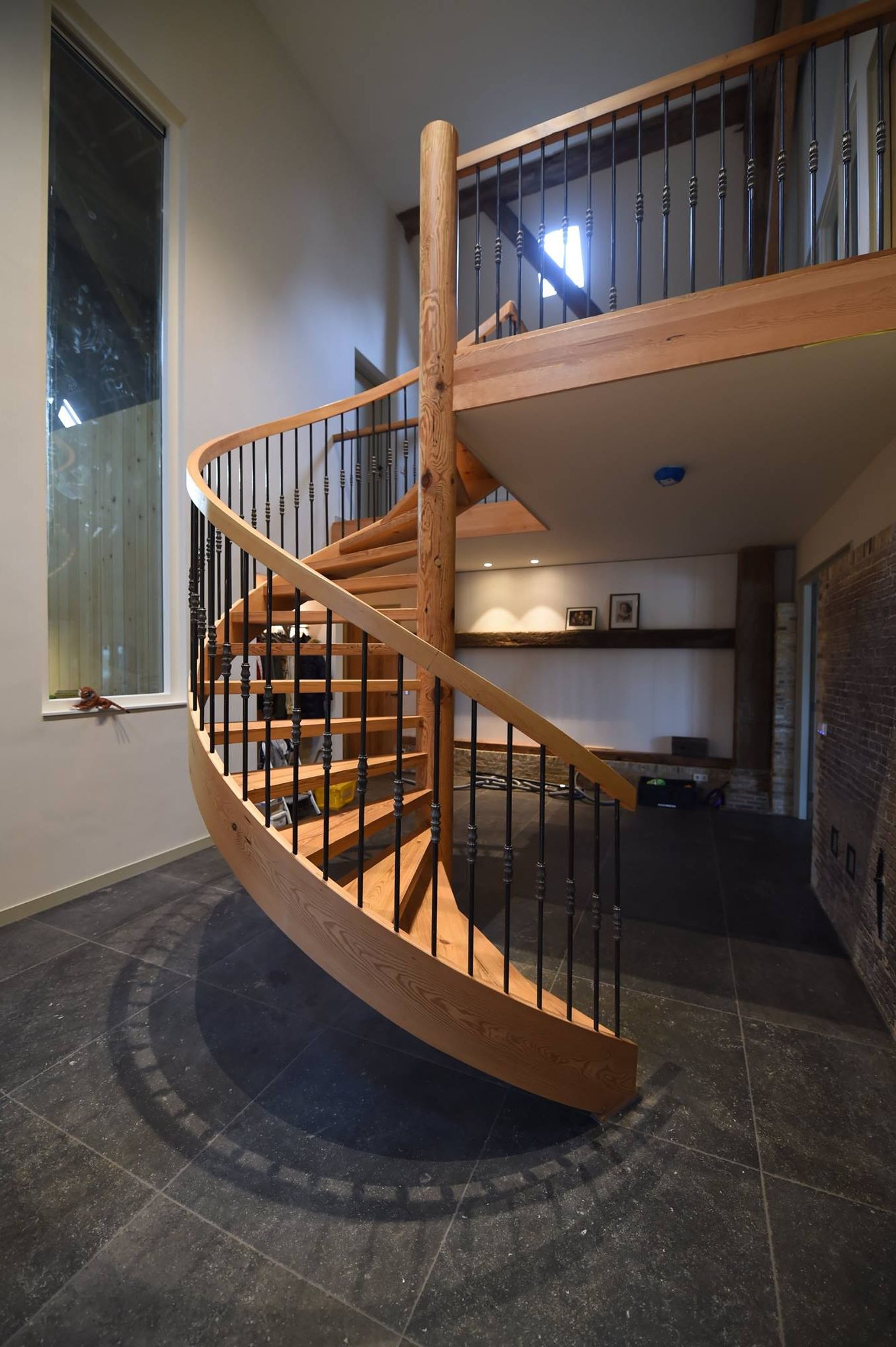 Oude boerderij 1870 te Sint Nicolaasga geheel gerenoveerd. Van het oude Amerikaanse grenen bintwerk hebben wij deze wokkeltrap en balustrade gerealiseerd