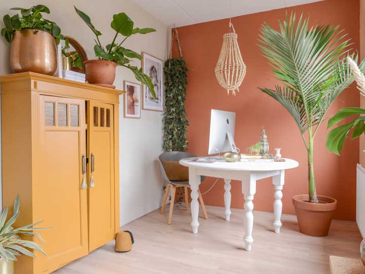 Kies voor twee basistinten en twee tot drie accentkleuren. Verdeel deze kleuren vervolgens goed over je interieur, dus de kleur van de muur bijvoorbeeld terug laten komen in een kast en accessoires. Je kan zelfs meubels een kleur geven om zo een mooie balans te creëren. Op die manier creëer je een harmonieus interieur waar je je echt thuis voelt!