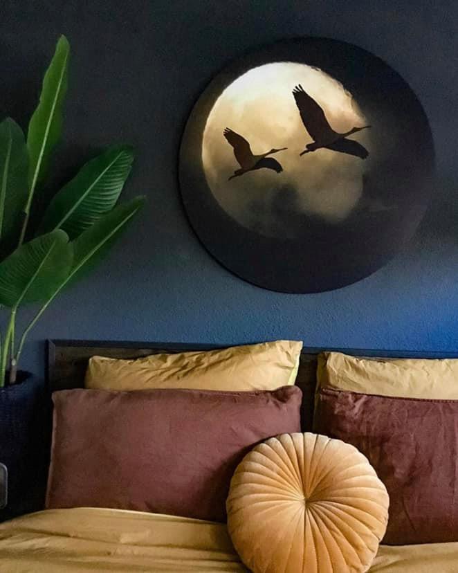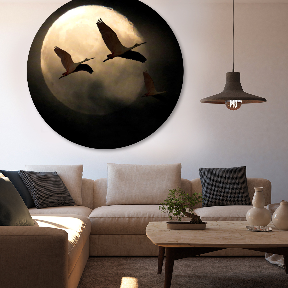 Prachtige sfeervolle afbeelding van Kraanvogels bij volle maan