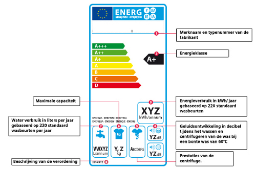 Een voorbeeld van een energielabel van een wasmachine met toelichting.