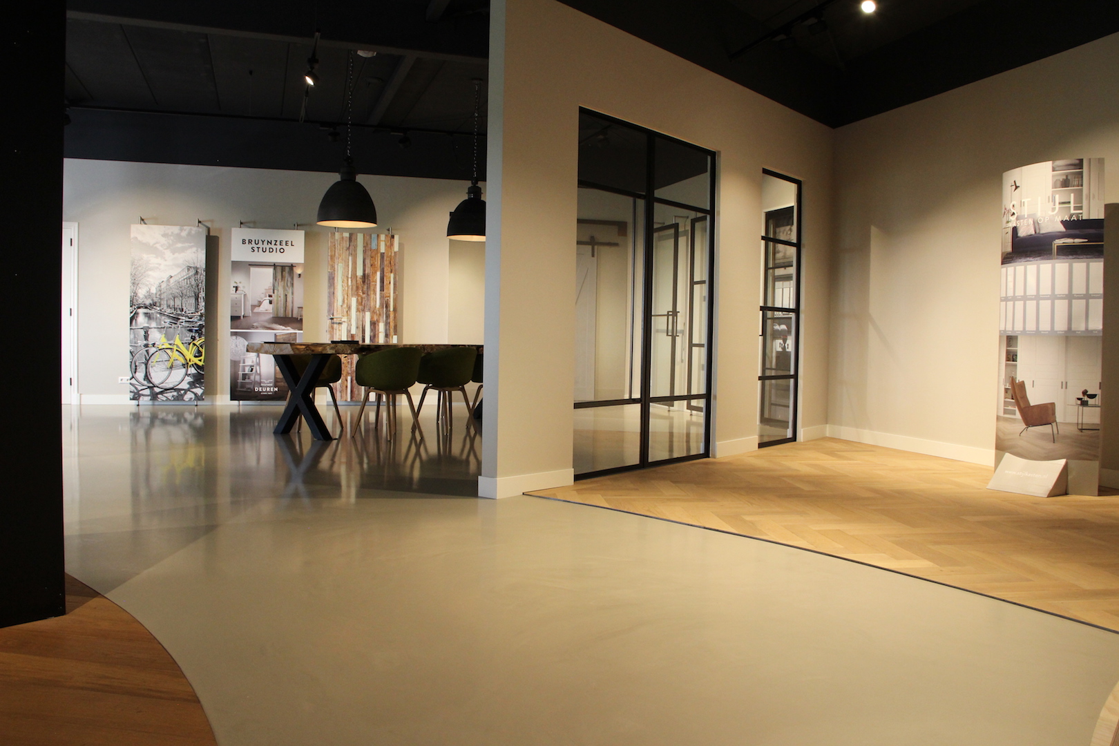 Vanuit dit punt heb je een prachtig overzicht over de gehele ruimte. Deze combinatie geeft een vloeiende beweging weer en zorgt voor een speels ritme in de showroom. De deuren worden zo zeer fraai tentoongesteld en uitgelicht en verleidt de mensen tot aanschaf van het product.