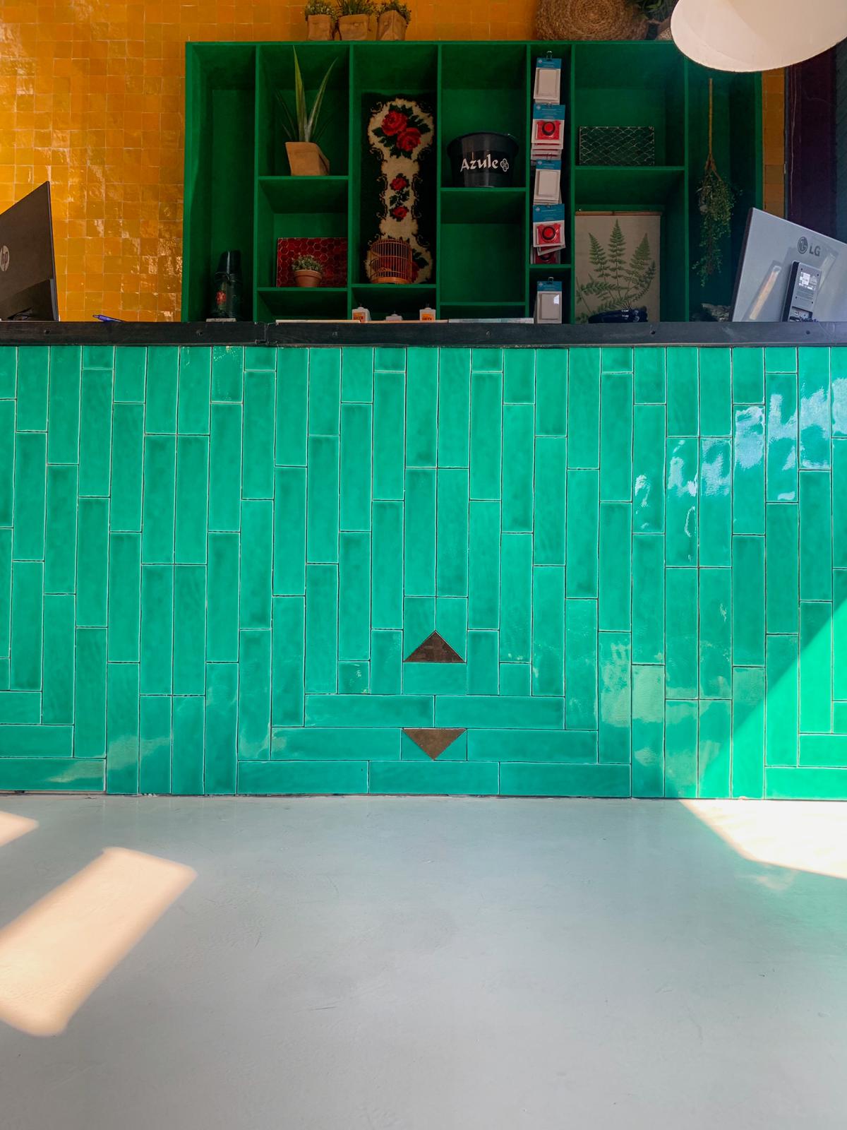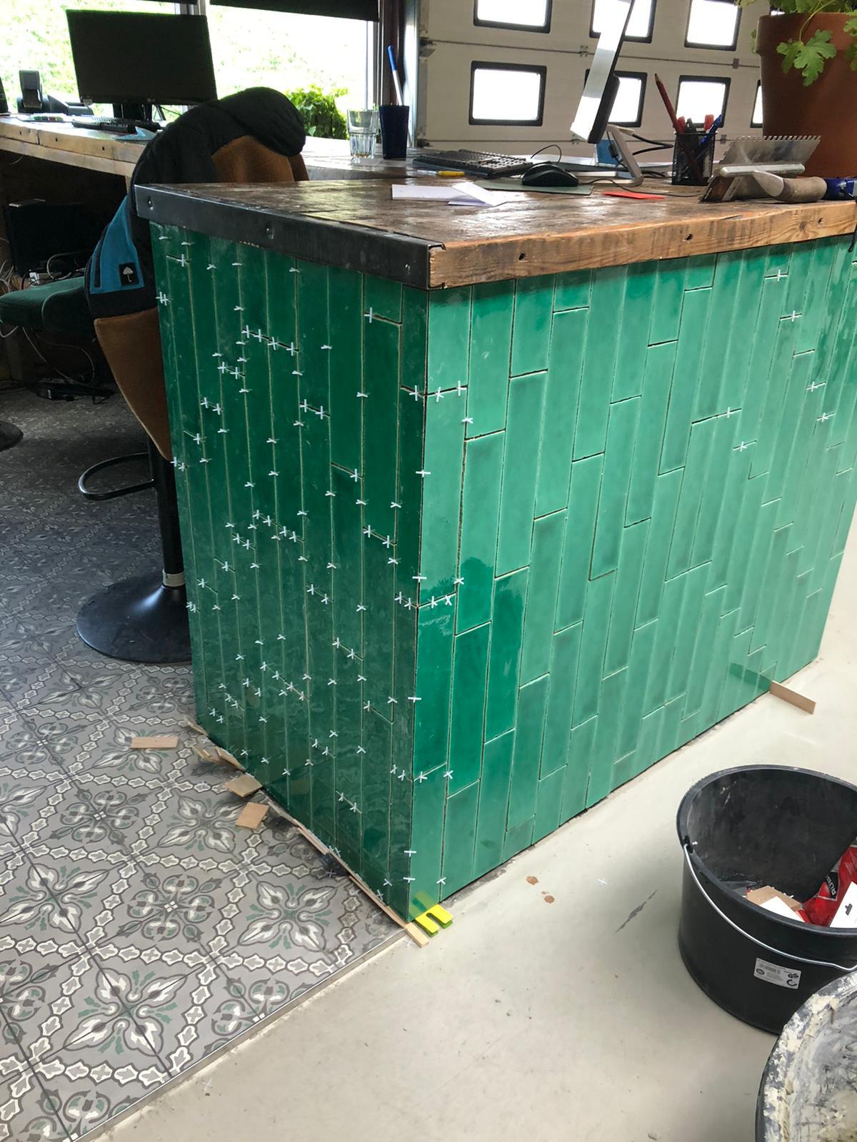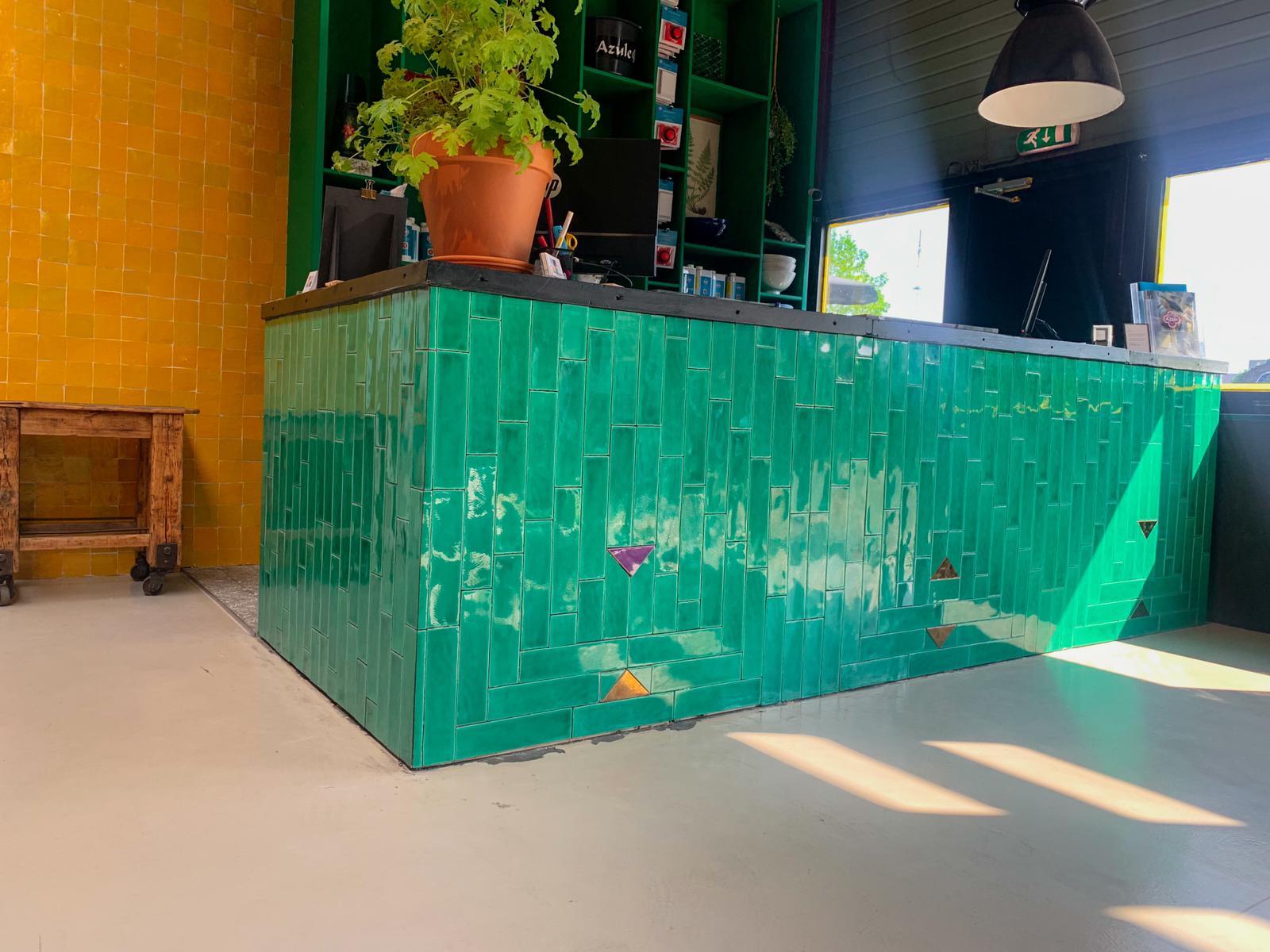 Vind jij dit nou helemaal te gek? Kom dan langs in onze showroom in Breda waar deze waanzinnige balie is te bewonderen. In showroom Utrecht of Breda kunnen we ook met je meedenken over jouw eigen tegelproject. Ga jij voor een groene Cabrera tegel, of liever donkerblauw, mosgroen of honinggeel? Ook kan je via onze website alvast alle kleuren bekijken en een sample bestellen!