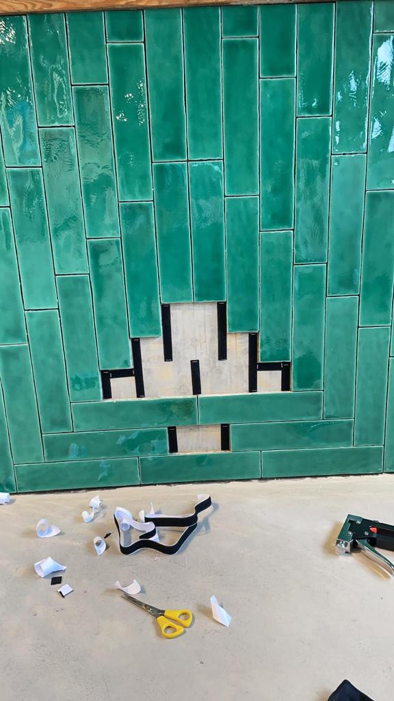 Het heeft flink wat denkwerk gekost, want hiervoor hebben we het hele patroon eerst tot in detail uitgedacht. Alle tegels hebben we op de grond gelegd om te zien hoe het golvende patroon tot stand moest komen. Nadat we enthousiast waren over het legpatroon, kon het tegelproject beginnen! We gingen aan de slag met tegellijm, tegelkruisjes en een nauwkeurig oog. Het is namelijk een erg precies werkje dus het vroeg nogal wat tijd en geduld.