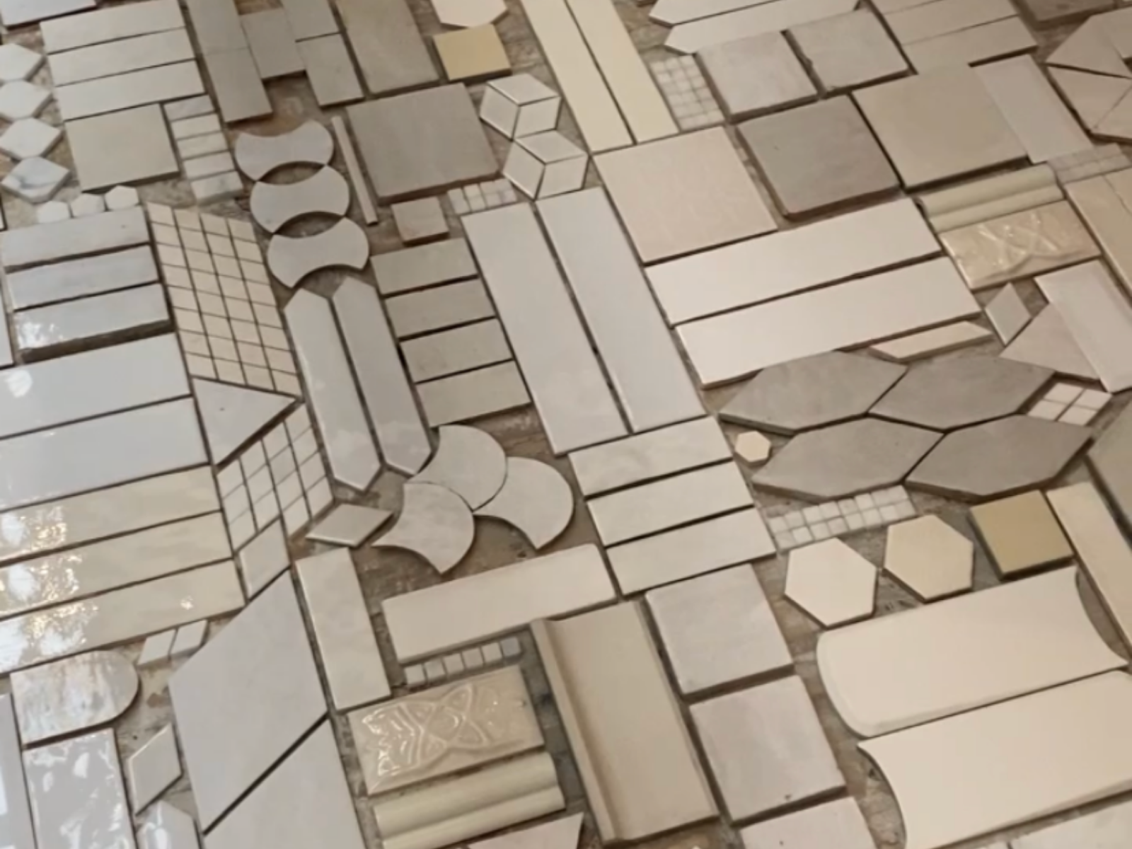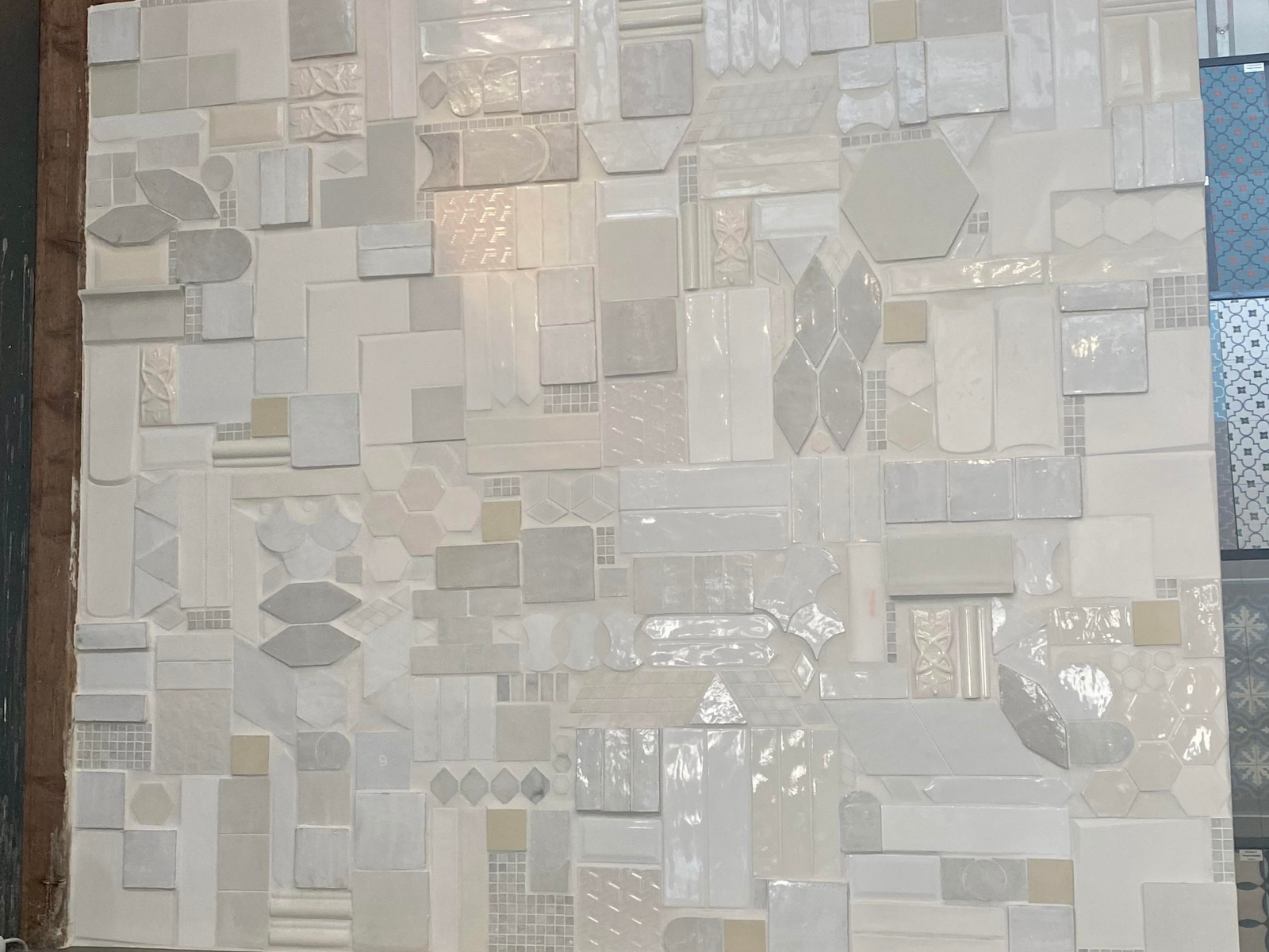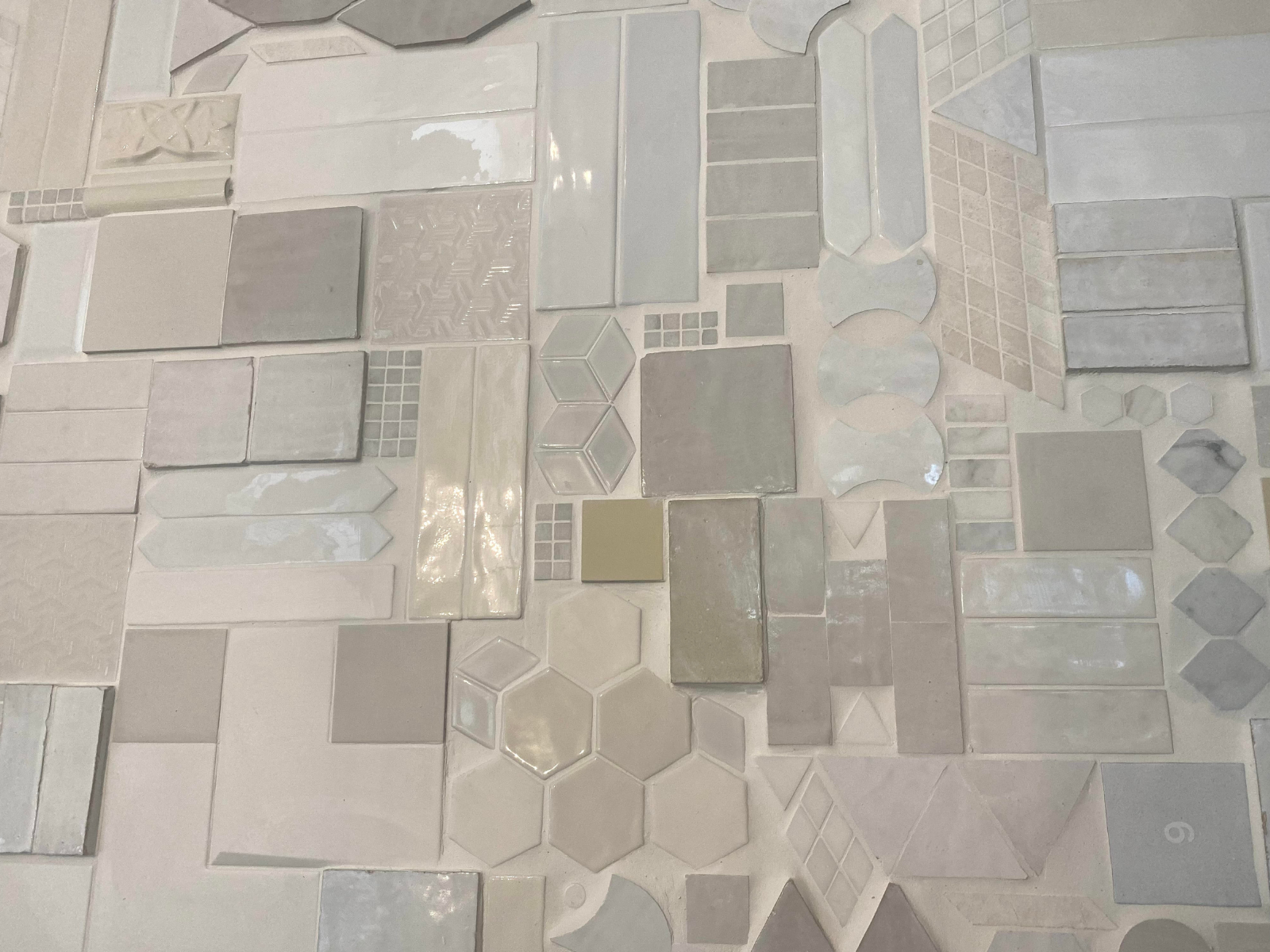 In onze showroom in Breda is het altijd moeilijk kiezen welke tegel we willen plaatsen in een kamer. Zo veel keus, en zo veel moois! Daarom bedachten we dit keer: We gaan ze combineren. Uit al onze verschillende collecties zijn we tegels gaan verzamelen, wel belangrijk: de tegels moeten dezelfde tint hebben (anders wordt het wel héél druk!). De tegels verschillen dus in vorm, dikte afmeting en afwerking maar hebben allemaal een blanke tint. Om een goed idee te krijgen hoe het eruit kwam te zien zijn we begonnen met tegels op de vloer leggen. Het was een gepuzzel, maar zo konden we elk tegeltje zo vaak verplaatsen als we uiteindelijk een mooi geheel kregen.