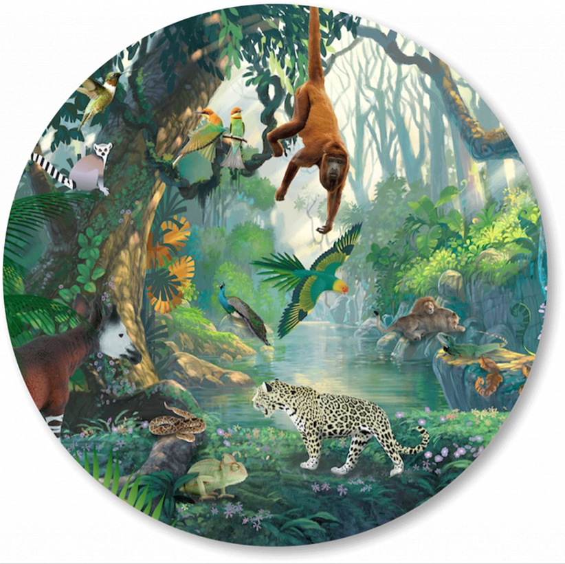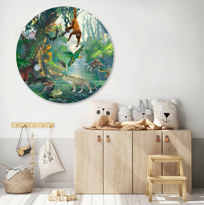 Superleuke wandcirkel voor de kinderkamer met een kleurrijke Jungle tafereel met leuke wilde dieren.