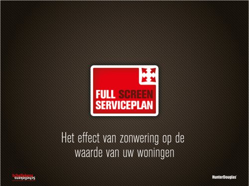 Voor Schellekens & Schellekens redenen om samen met Hunter Douglas het Full Screen Serviceplan te ontwikkelen: een totaal concept van advies tot en met onderhoud en natuurlijk vervanging van zonwering. Op de site www.fullscreenservice.nl is alle informatie over dit concept te vinden.