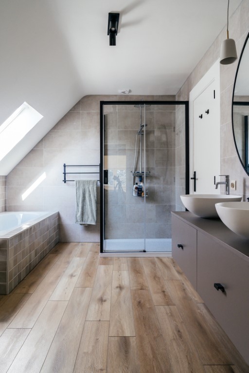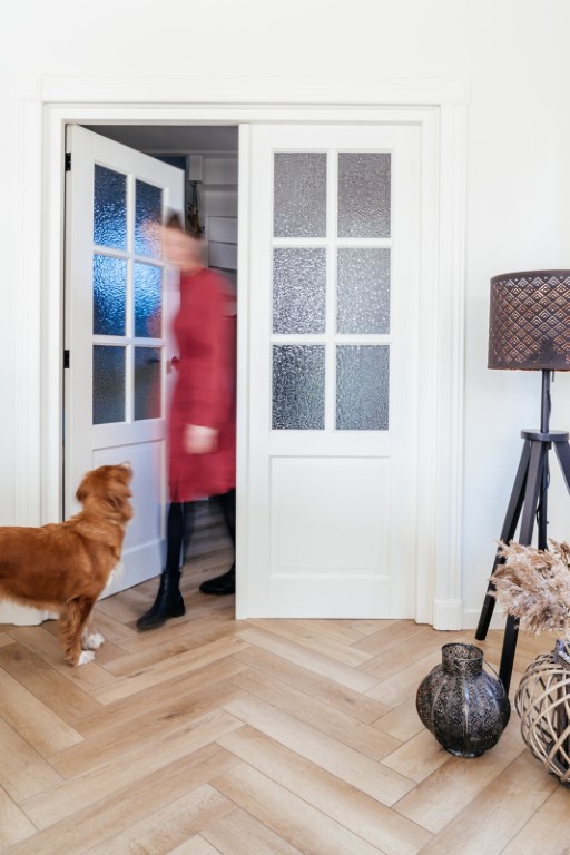 Het koppel koos ervoor om de PVC-vloer door te trekken in de volledige woning. Beneden werd gekozen voor een mooie, naturelle visgraatvloer, namelijk de Yukon Mistral. Boven werd voor dezelfde vloer gekozen, maar dan in plankenvorm. Deze vloer werd ook geplaatst in de badkamer en dat zorgt voor warmte, zowel qua gevoel aan de voeten als uitzicht.