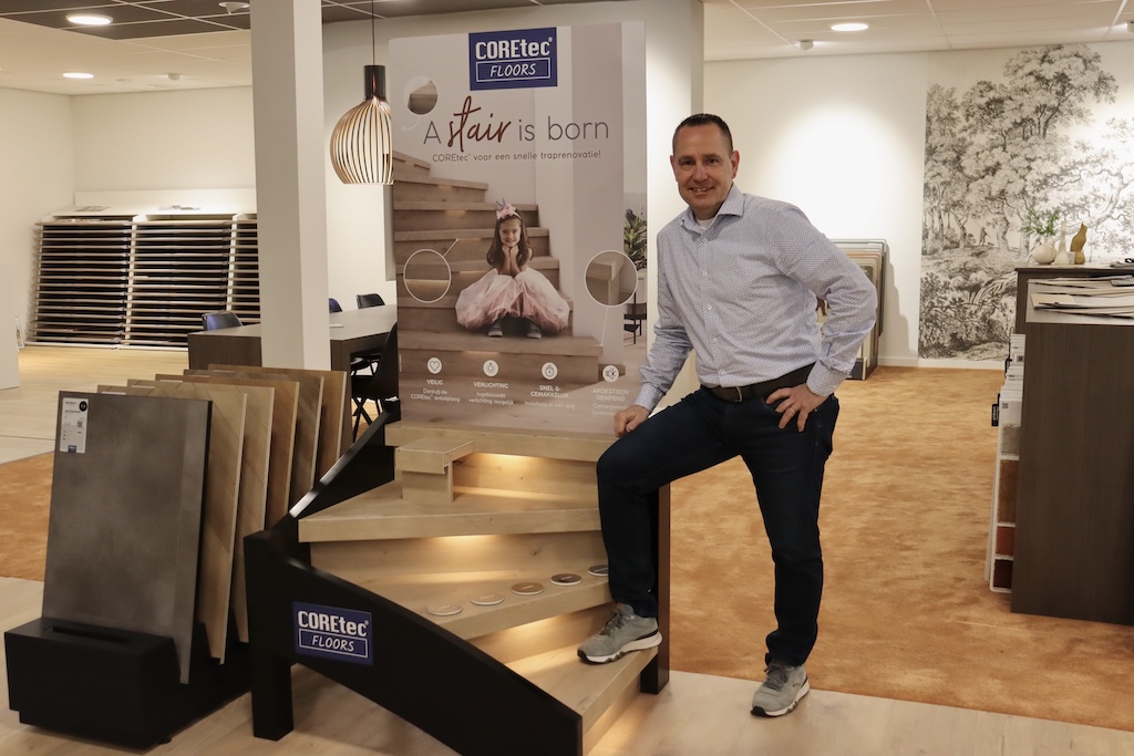 Een merk dat daarbij perfect aansluit, is COREtec®, waarvan hij officieel dealer is. “We zijn ermee in aanraking gekomen via onze groothandel Headlam. COREtec viel meteen op door zijn kwaliteit en innovatieve eigenschappen. Het unieke zit ‘m in de geïntegreerde kurk onderlaag. Die zorgt voor geluidsdemping tot 10 dB, isoleert goed en egaliseert kleine oneffenheden in de ondervloer. Bovendien hebben de planken een mooie, matte uitstraling die heel natuurlijk oogt.”