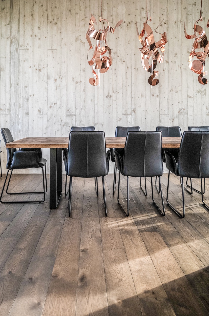 Deze zwarte houten vloer van Cinzento Custom Made® is opgebouwd uit drie lagen massief eiken.