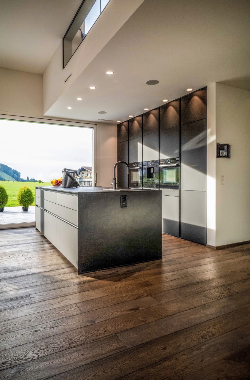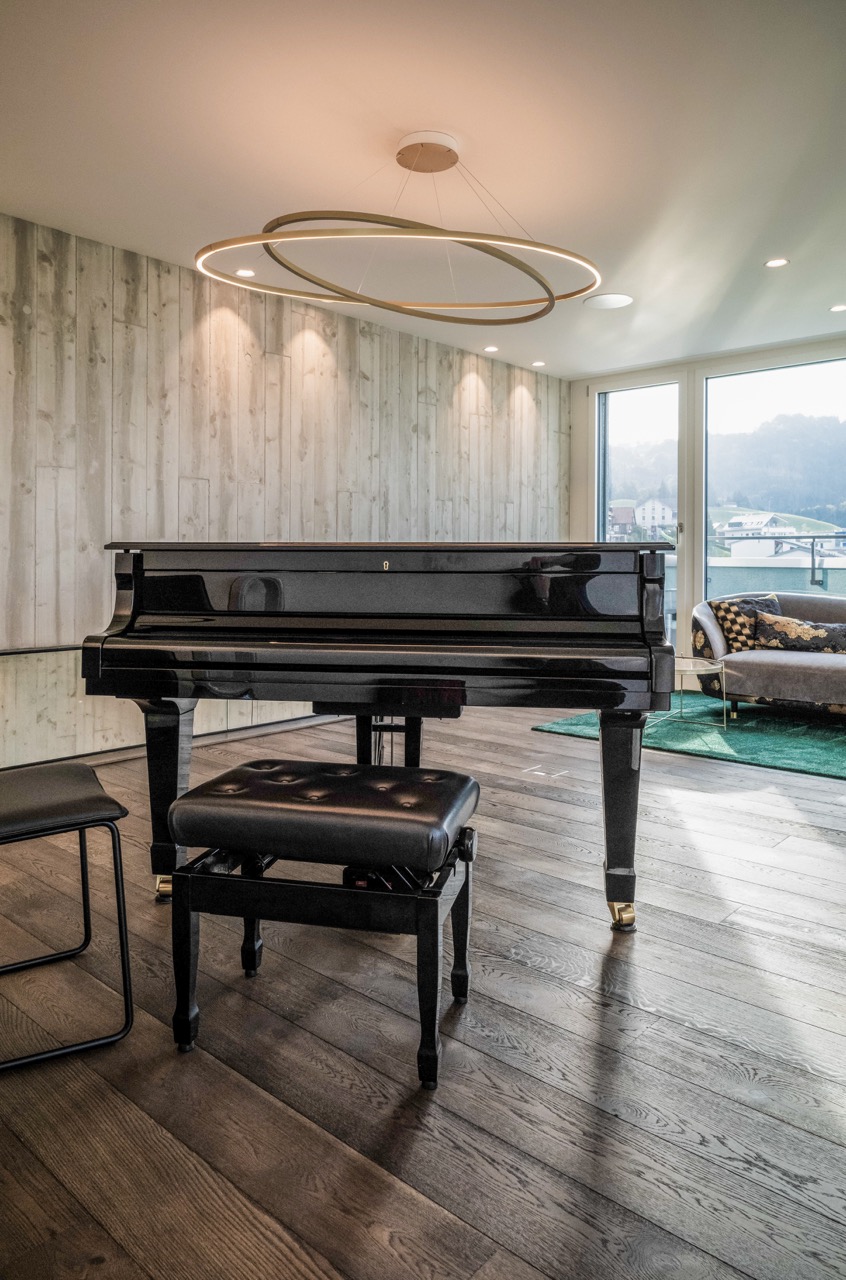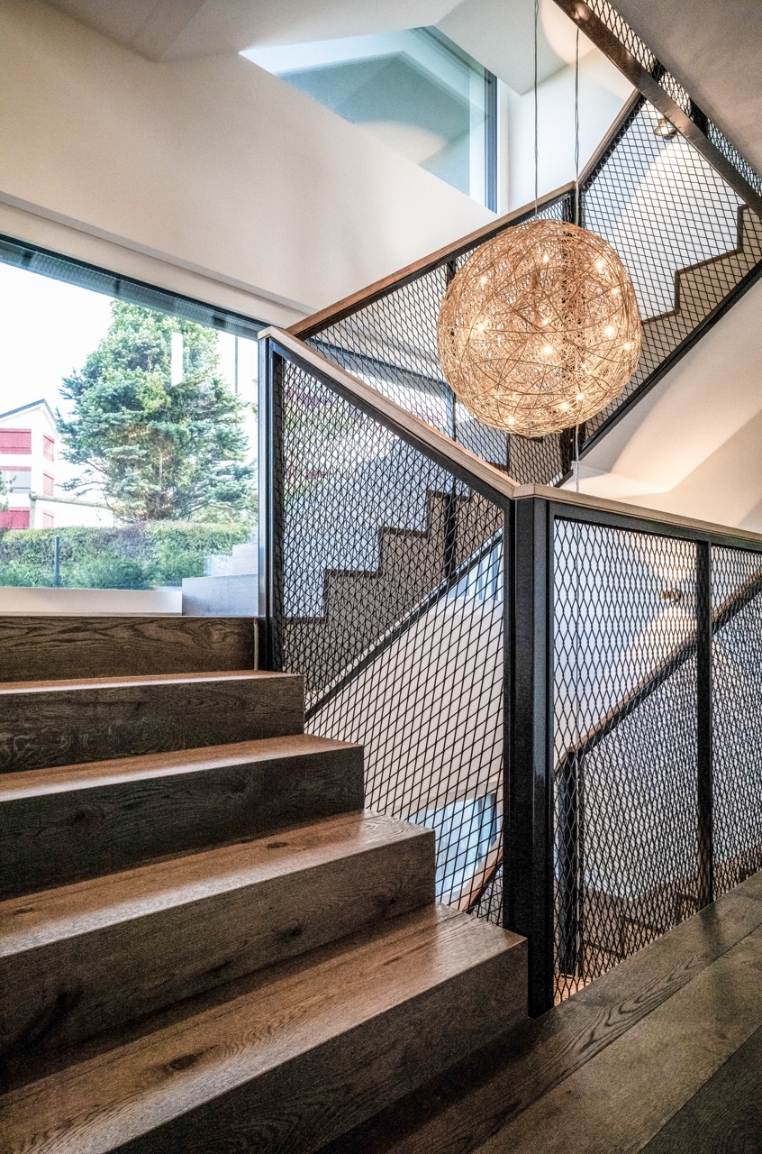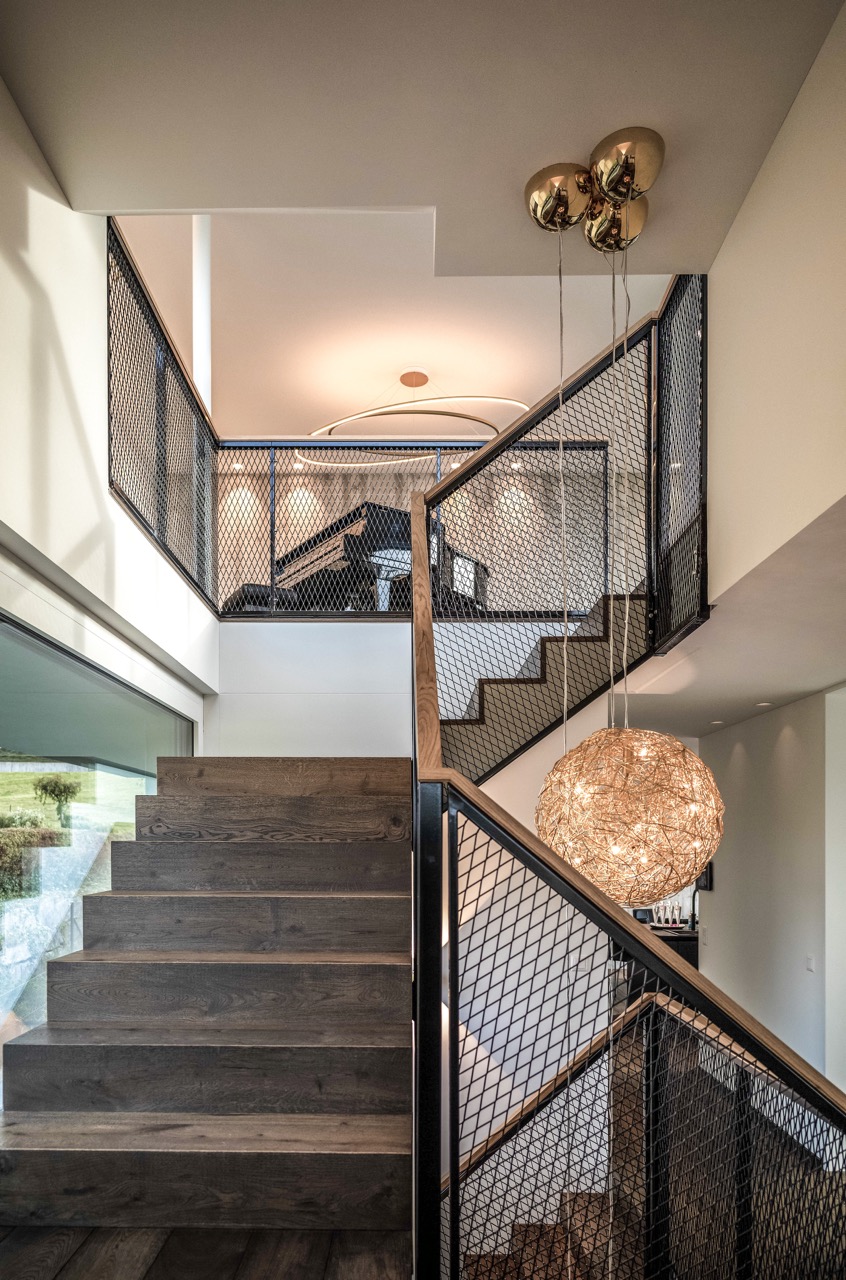 De prachtige eikenhouten vloer in deze villa heeft een rustieke uitstraling en is met Cinzento kleur 7000 geolied. Ook de trap is hiermee behandeld.