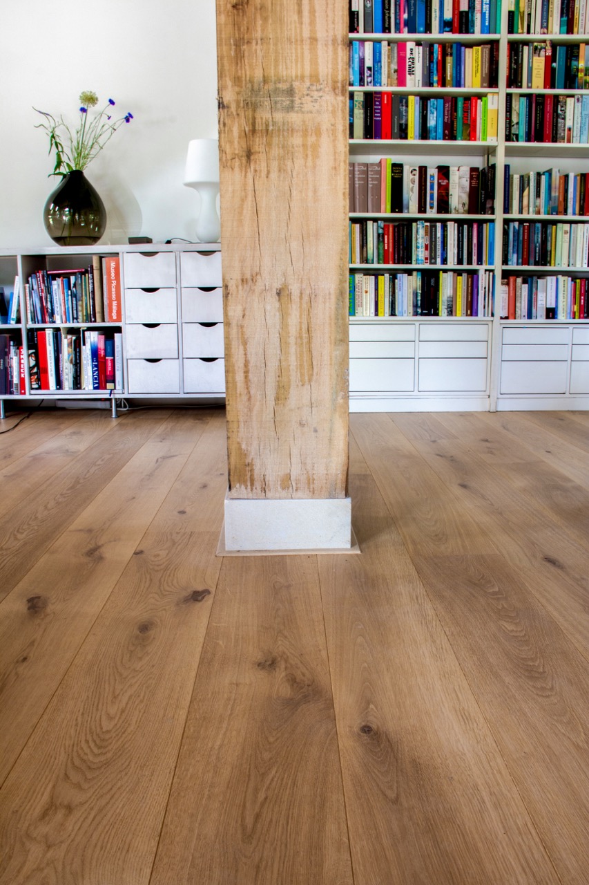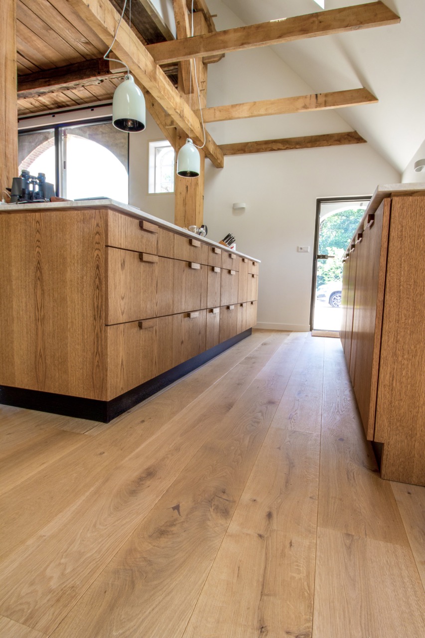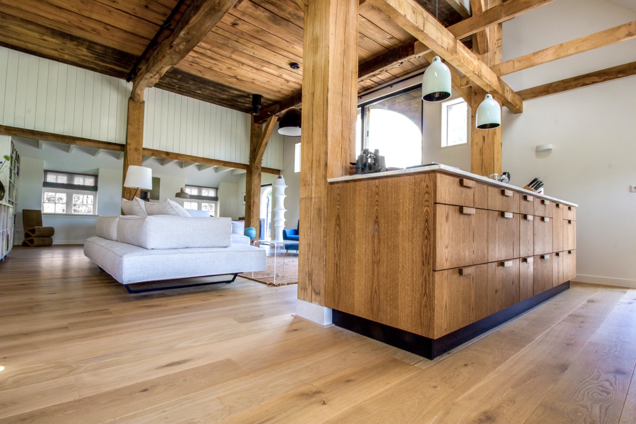 Bekijk hier de prachtige houten vloer, gelegd in een gerenoveerde boerderij. Hout haalt de natuur in huis, wat met alle houten accenten ook zeker is gelukt.