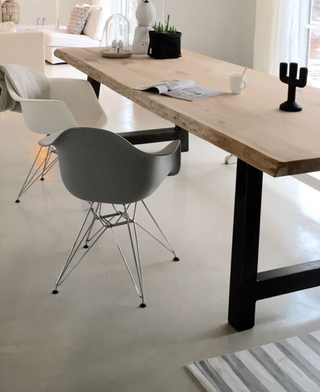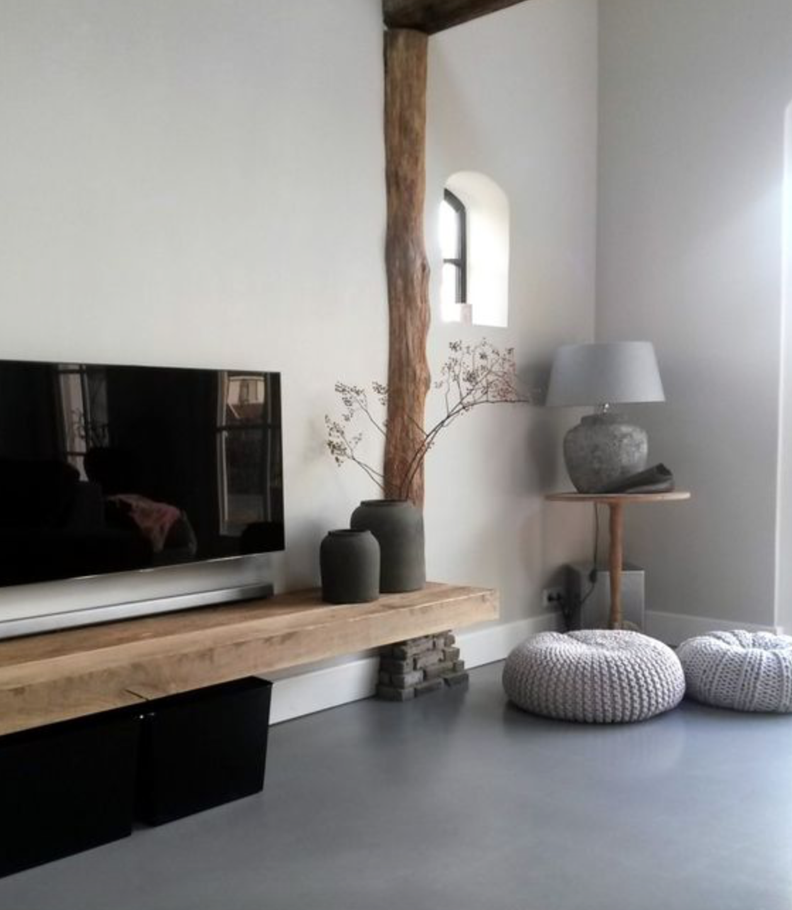 De combinatie van natuurlijke materialen is een geweldige toevoeging aan je interieur. Een inspirerend voorbeeld is het combineren van beton met hout, zoals in onderstaande afbeelding. Een betonlook gietvloer in een interieur met houten balken, -deuren en -meubels is een garantie voor sfeer en stijl.