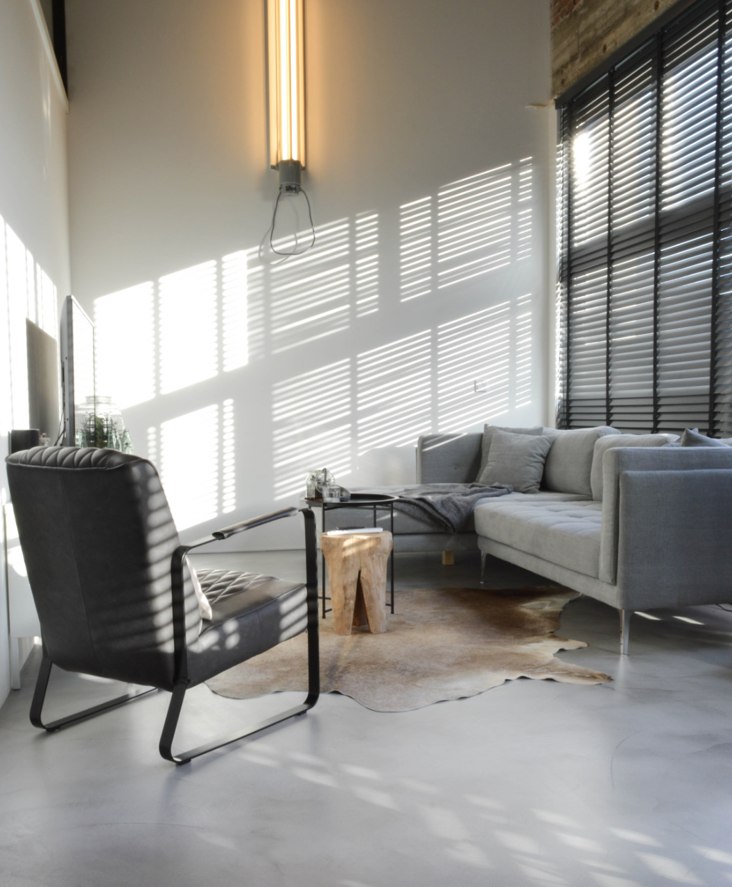 Het dunne dierenhuid-vloerkleed zien we steeds vaker terug in het interieur. Het geeft een sfeervolle en stoere uitstraling wanneer het op een gietvloer wordt geplaatst.