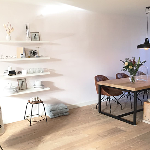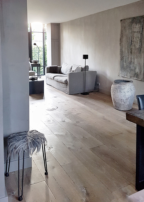 Wat betreft afwerking en kleur zijn de opties eindeloos. Een noten vloer kan er compleet anders uitzien met drie lagen matte lak dan met twee lagen hardwaxolie. Voor eikenhout zijn er talloze kleuropties, van extra witte olie tot diepzwart en alles daartussenin. Vraag stalen aan en neem ze mee naar huis, zodat je kunt zien hoe de vloer past bij jouw interieur, vooral met betrekking tot lichtinval en keukeninrichting.