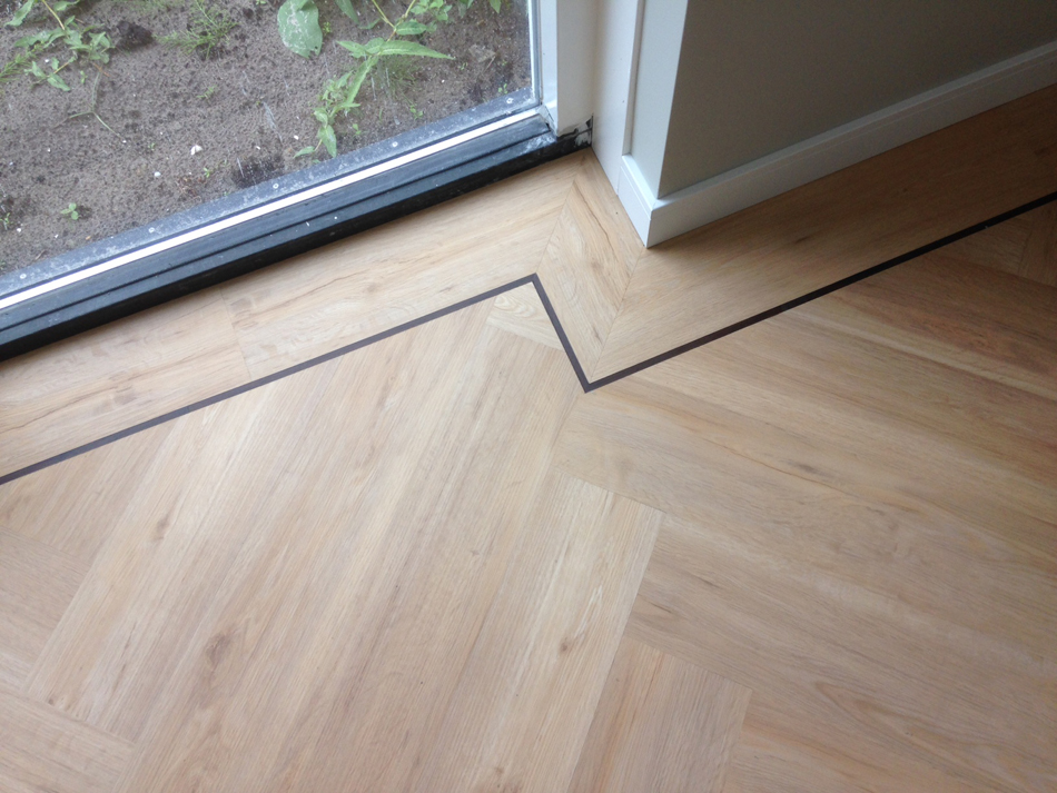 In deze nieuwbouwwoning hebben we een PVC-vloer in visgraat motief geplaatst (met vloerverwarming). De afwerking met band en bies maakt het geheel compleet! aldus Parketmeester Alkmaar.