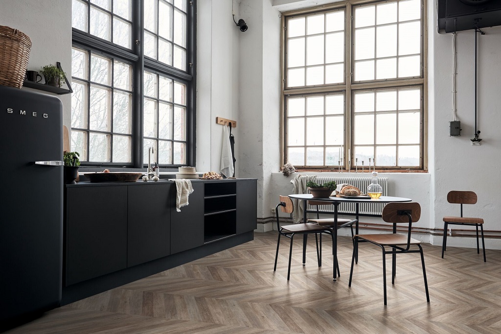 “Het belangrijkste instrument daarvoor was een goed materialen- en kleurenplan. Als ontwerper (en tevens onderdeel van het Forbo designteam) was ik heel blij met de keuze van Mariska voor Marmoleum op de vloer. Het is heel goed toe te passen in woonhuizen. De Marmoleum Splash, die is geselecteerd voor de woonetage en het souterrain, heeft een neutrale ondertoon met een marmering met subtiele kleurschakering. De meubels komen hierop goed tot hun recht, zeker ook de vintage houten meubels die het gezin al had. In de keuken heb ik een donkere Marmoleum Cocoa gekozen. Hierdoor wordt de keuken visueel afgekaderd ten opzichte van de rest van de etage. Verder is het een ideale basis om te verrijken met texturen in de verdere aankleding. Om meer tactiliteit aan de ruimte te geven, heb ik bijvoorbeeld velours gordijnen voorgesteld.”