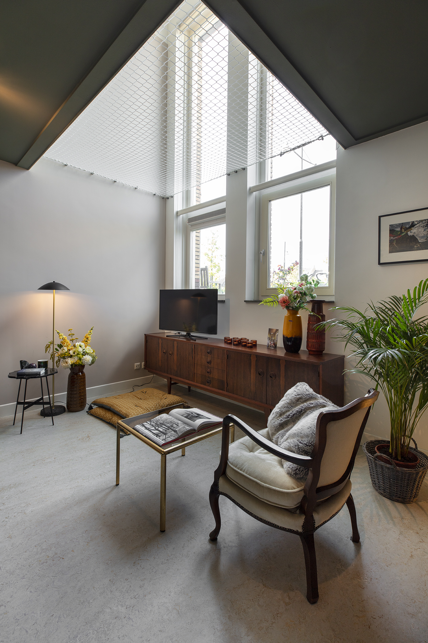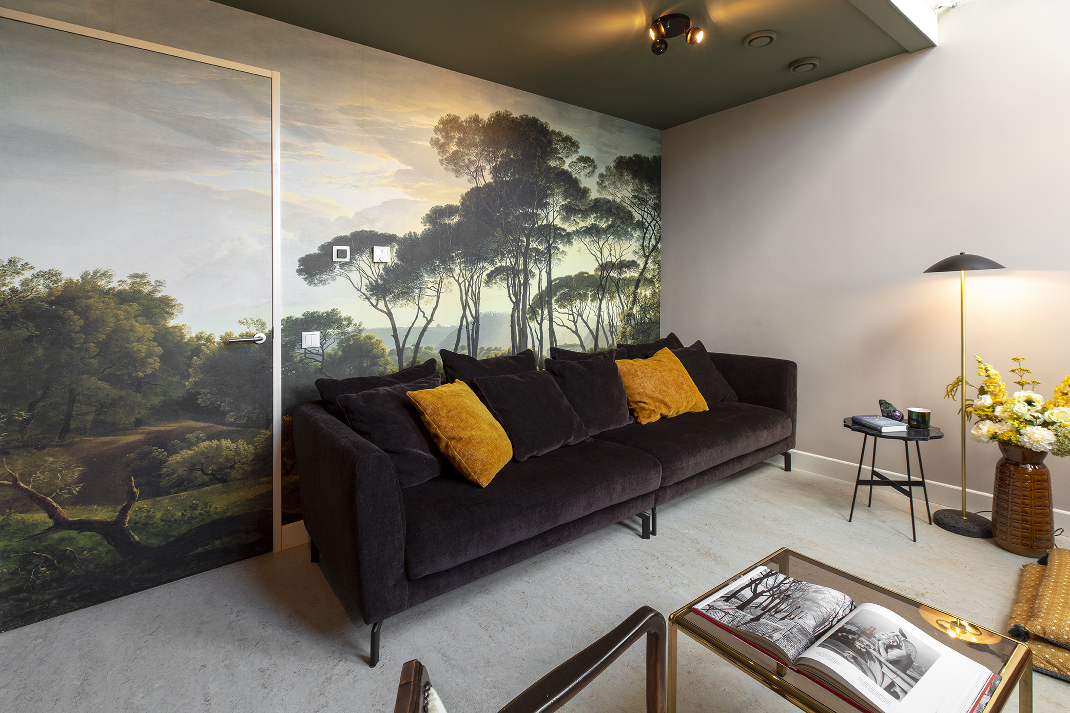 Thomas: “In het souterrain is een ‘family room’ gecreëerd, aangezien het gezin behoefte had aan een extra informele leefruimte. Dat je daar vandaan minder contact hebt met buiten, compenseerden we door een hele wand te vullen met een uitvergroting van een landschapsschilderij uit het Rijksmuseum op behang. Dat geeft een mooie suggestie van natuur. Als je de voordeur binnenstapt, kijk je via een grote vide in het souterrain en wordt je blik meteen naar dat landschap getrokken. Om te zorgen dat er zo veel mogelijk daglicht in de familiekamer valt, hebben we geen balustrades om de vide gemaakt, maar er een horizontaal net in gespannen, waarin je kunt liggen als in een hangmat. De kinderen vinden dat natuurlijk heel grappig om te doen.”