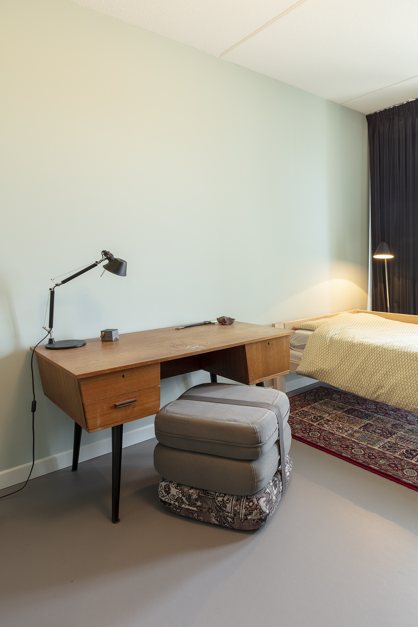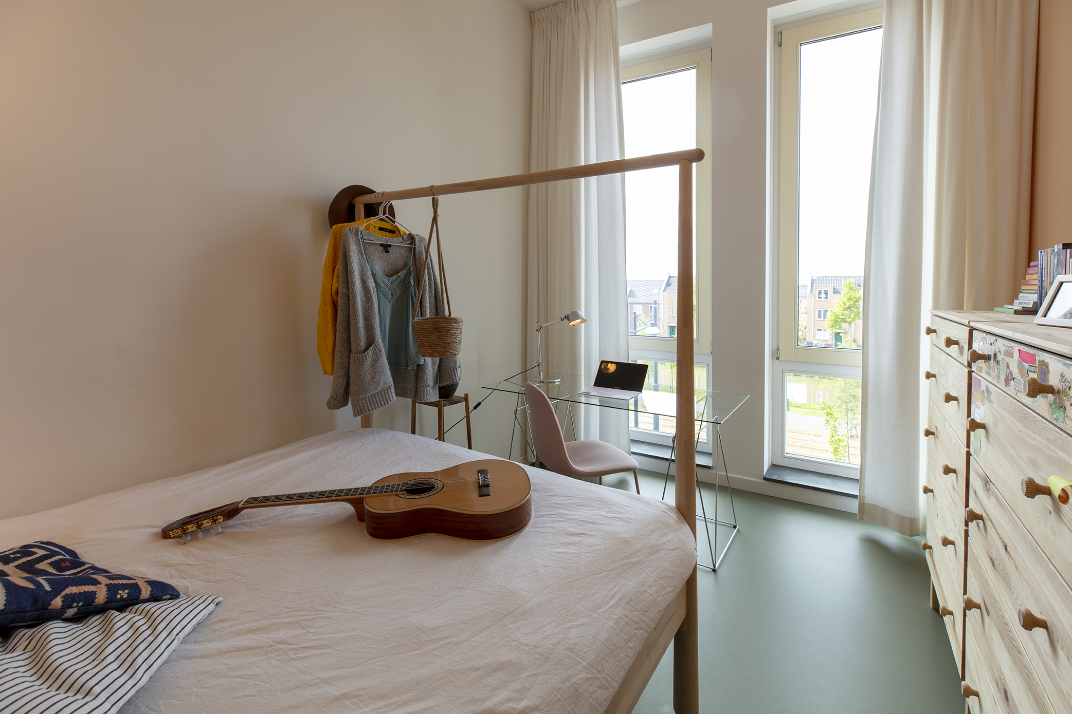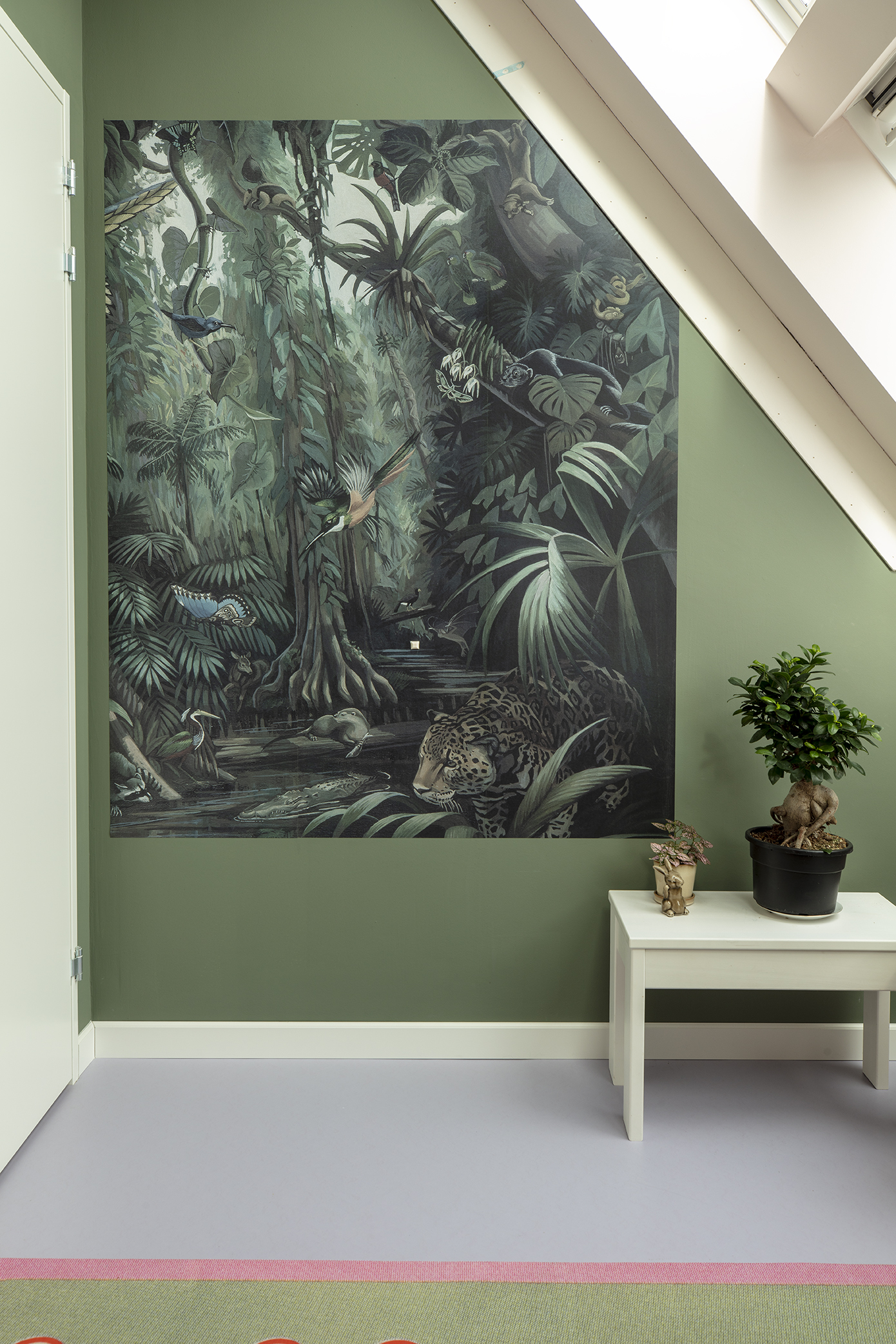 Mariska: “Onze jongste dochter koos een lila vloer. De kamer mocht van haar niet te meisjesachtig worden, daarom wilde ze op de wand een stevig groen als tegenhanger. De schilder had aanvankelijk een te lichte kleur gebruikt, dat moest dus over.”