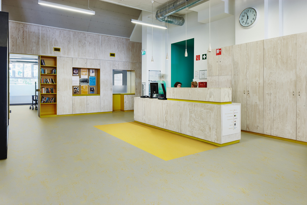 Marmoleum Solid Glow bestaat uit zes hele felle, superintense kleuren waar grijs juist de ondertoon is. Tamar: 'Met deze vloer kun je duiding geven en zones creëren binnen een grote open ruimte, zoals een open kantoortuin. Een stukje Glow rondom de koffiemachine met Shimmer in dezelfde kleuren daaromheen als basisvloer.'