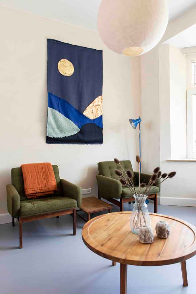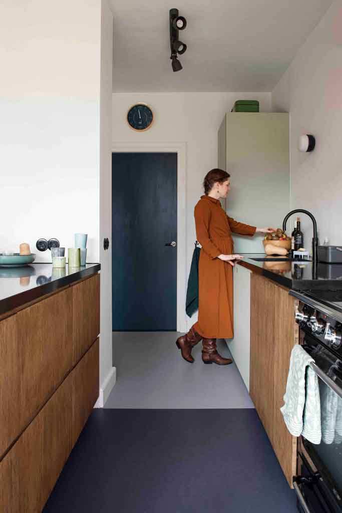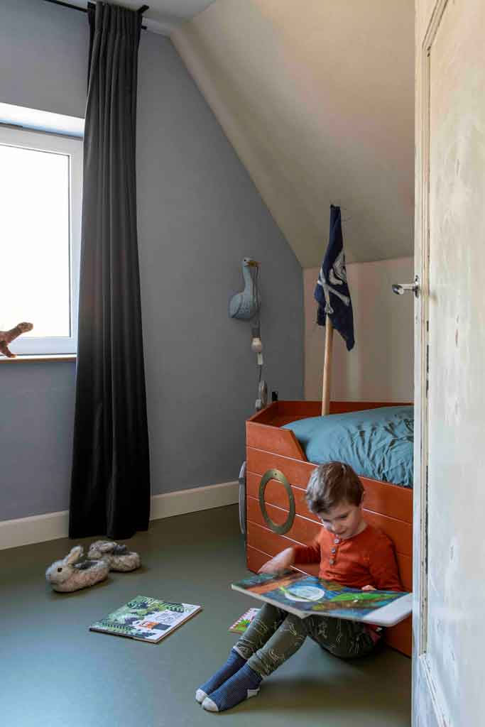 “Ook voor de vloer kiezen we bewust voor een Nederlands product: Marmoleum. Deze vloeren waren in de jaren ’30 al populair en ruim 100 jaar later zijn de ingrediënten niet veranderd. Het is de enige CO2-neutrale vloerbedekking ter wereld. Boven kiezen we voor Rosemary Green uit de Walton-lijn, genoemd naar de uitvinder van linoleum. Beneden ligt de Cocoa-lijn waar cacaoschillen in zijn verwerkt. Deze schillen zijn een restproduct uit de chocoladefabrieken die in de buurt van de Marmoleum-fabriek staan. De lichtgrijze en donkerblauwe vloer heeft een bruine chocoladespikkel. Een jaren ‘30 knipoog naar de originele granito vloer in de gang. Lokaal, natuurlijk en authentiek, check!”