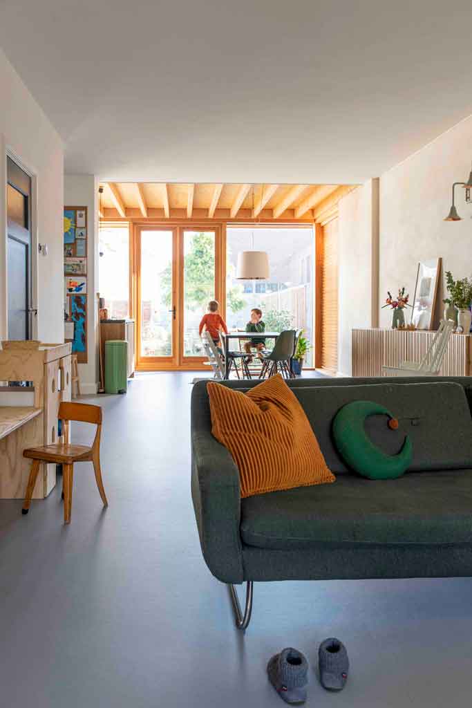 “Dit avontuur begon vanuit de wens om zo duurzaam mogelijk te leven. Dat is gelukt: een jaar na de sleuteloverdracht gingen we van energielabel G naar A++. Maar de beloning blijkt groter dan een lage energierekening. Het triple glas zorgt voor rust in huis, de drukke weg voor de deur is amper te horen. De leem op de muren maakt het binnenklimaat extra prettig. Door de lagetemperatuur-vloerverwarming is de temperatuur binnen constant en hebben we geen loeiende radiatoren meer. En het Marmoleum is heerlijk aan je voeten, de kinderen spelen uren op de vloer. Dus ja, het was een uitdagend project, met daarnaast ons werk en 2 kleine kinderen. Maar het was het 100% waard.”
