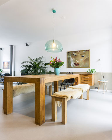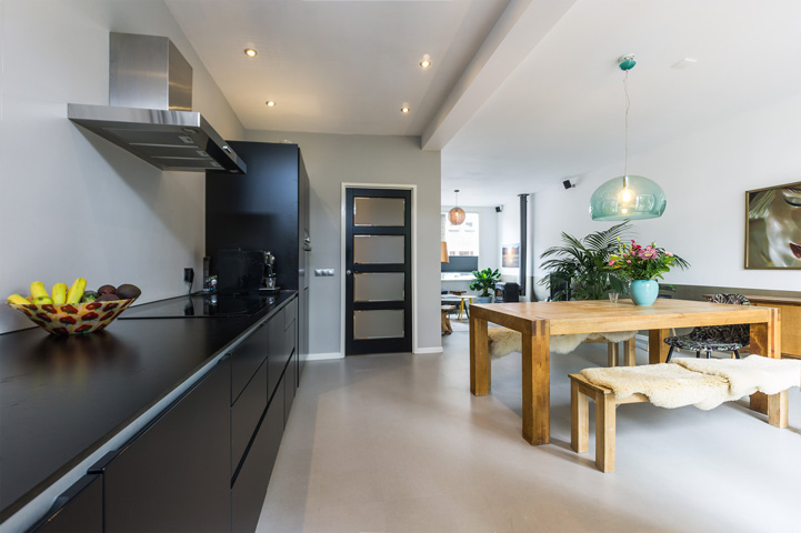 “Eigenlijk wilden we een gietvloer, maar dat is met dit oude huis en de houten ondervloer geen optie. Toen hebben we gekeken wat erop leek en waarbij vloerverwarming mogelijk was. Zo kwamen we bij Marmoleum Click, een CO2-neutraal geproduceerde vloer van Forbo Flooring. Ik wilde alleen niet de naden zoals je die krijgt als het van de rol komt. Degene die de vloer zou leggen, kwam met het clicksysteem als idee. Dat heeft heel goed uitgepakt.”