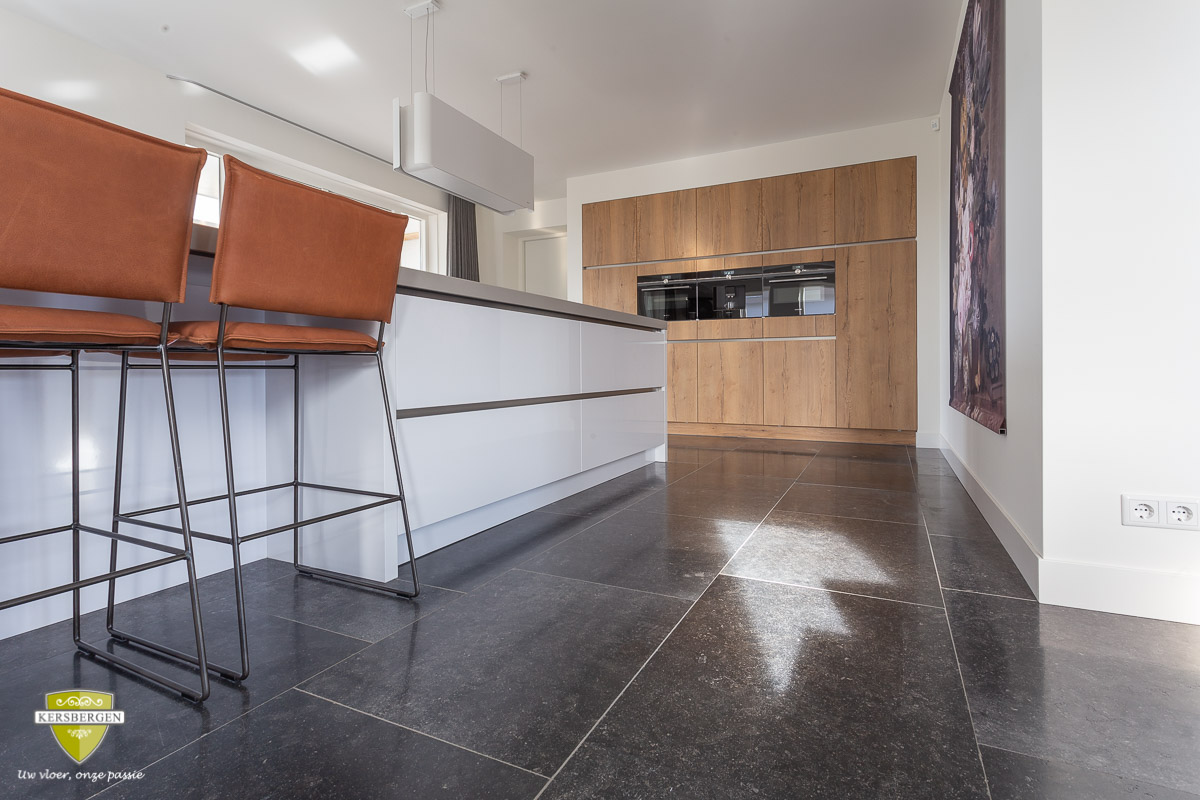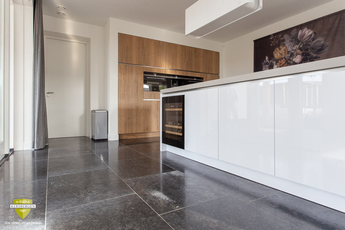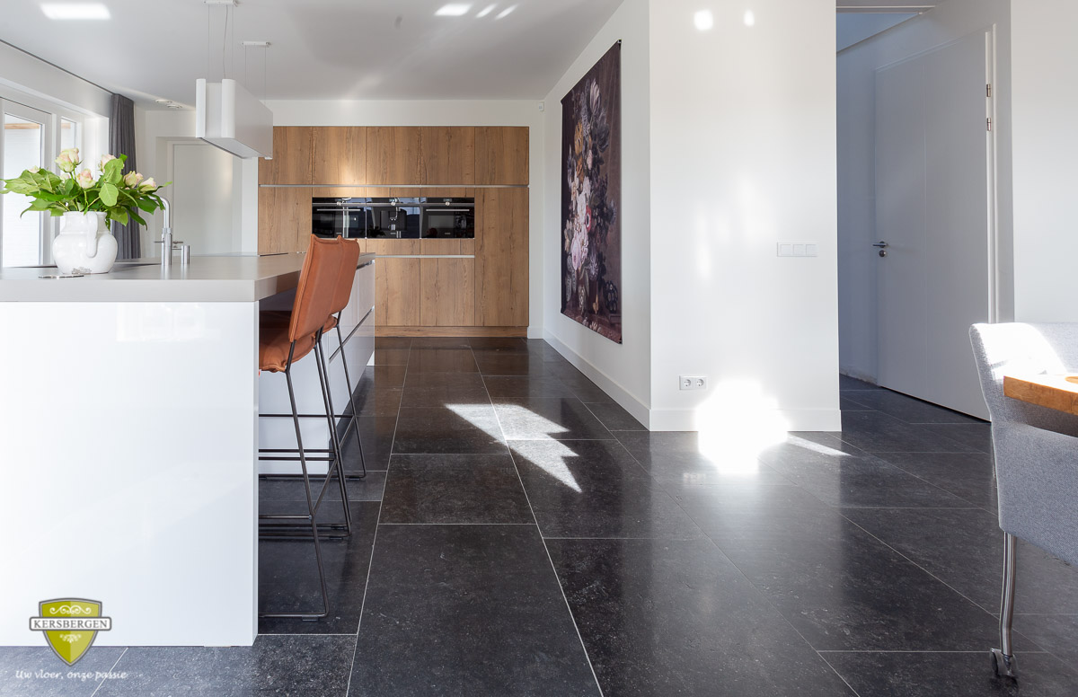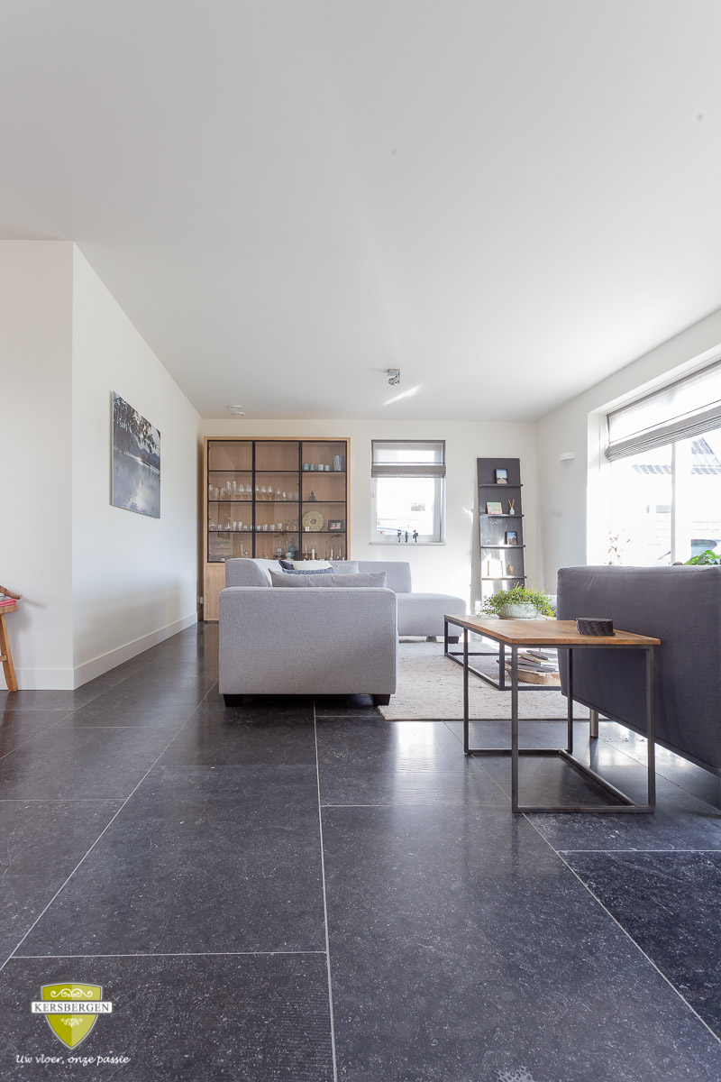 Belgisch hardsteen vloertegels met een licht geborsteld oppervlak. Belgisch hardsteen is geschikt voor moderne en stijlvolle interieurs