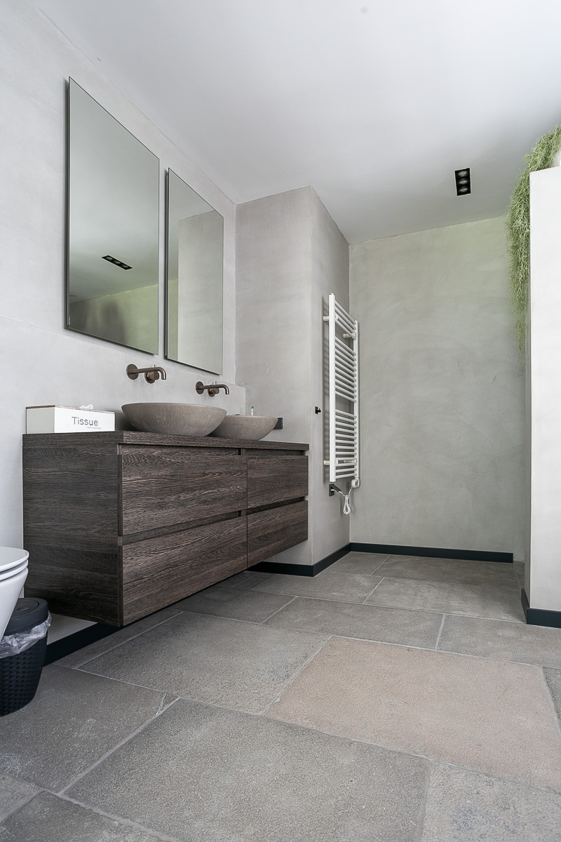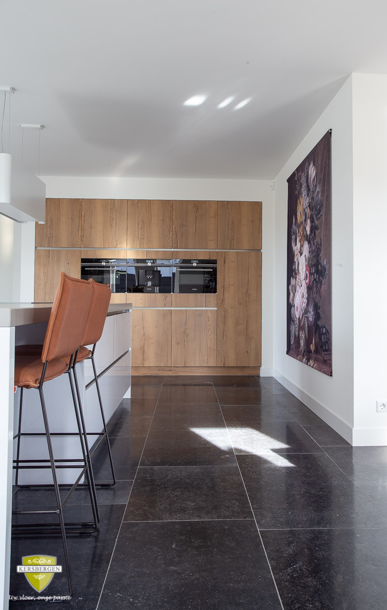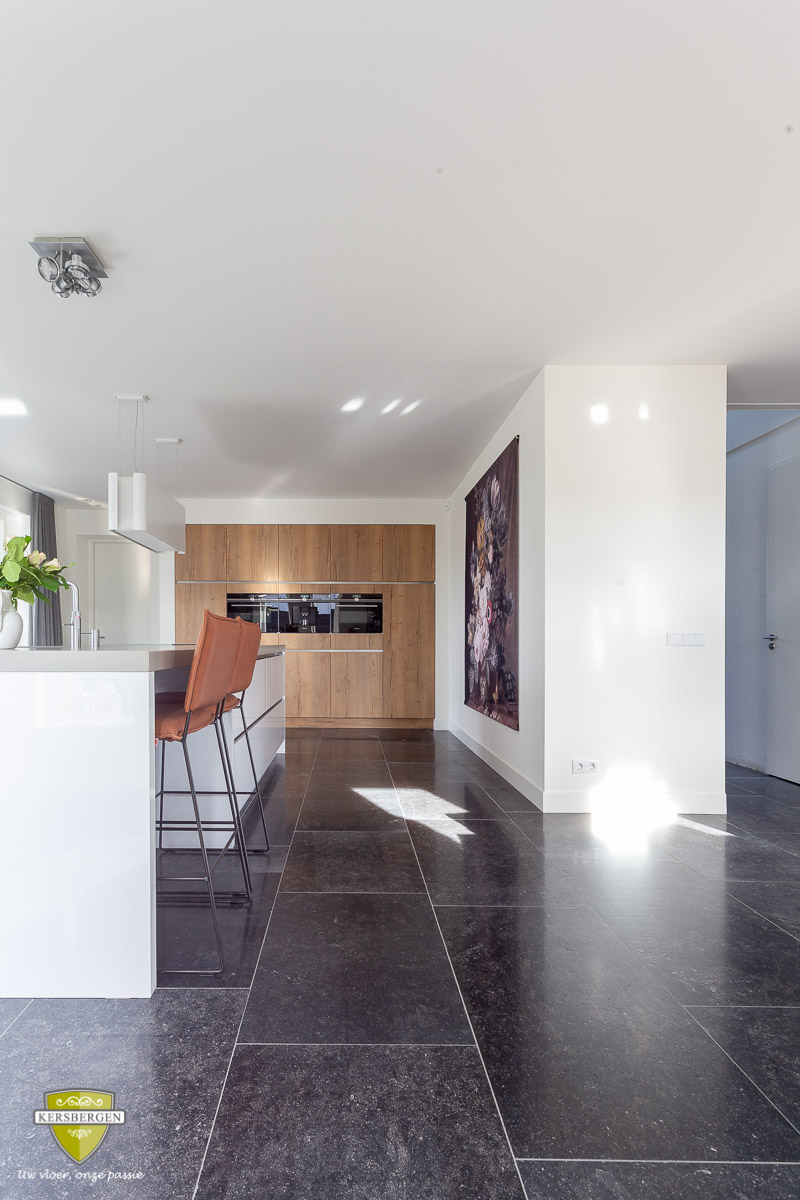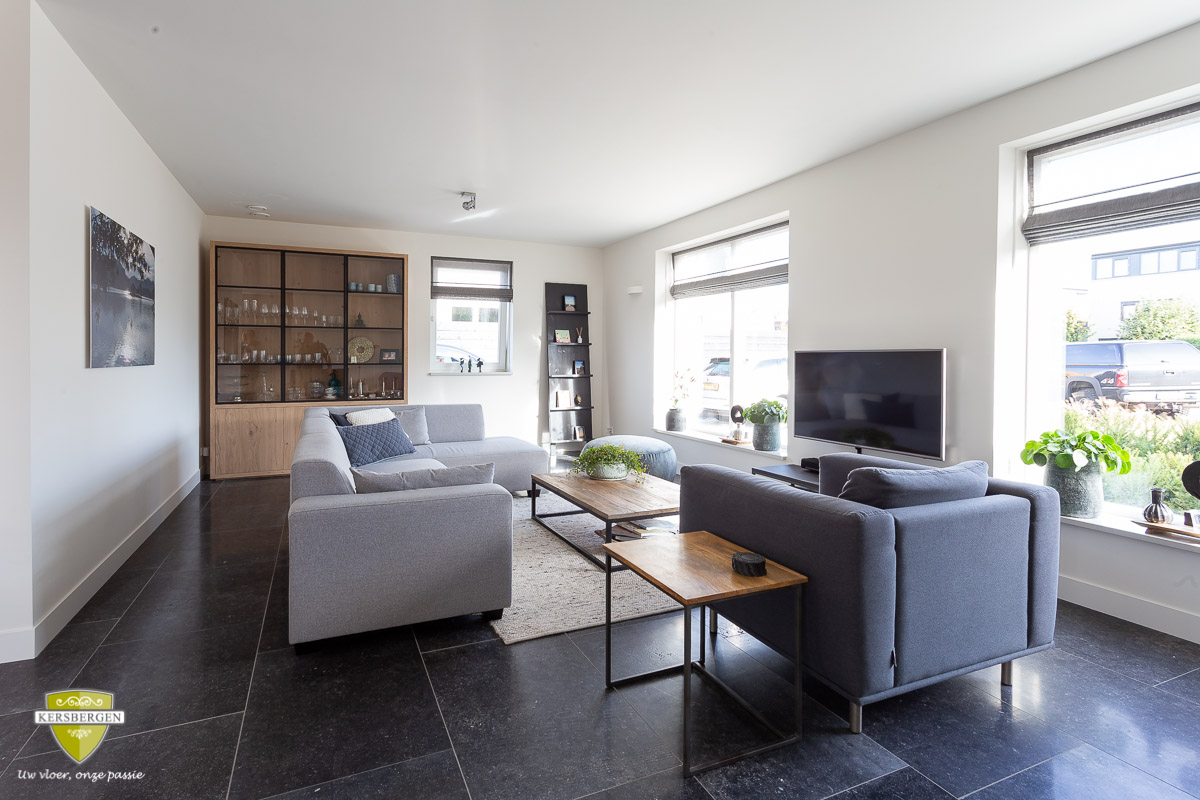 Belgisch hardsteen vloertegels met een licht geborsteld oppervlak. Belgisch hardsteen is geschikt voor moderne en stijlvolle interieurs