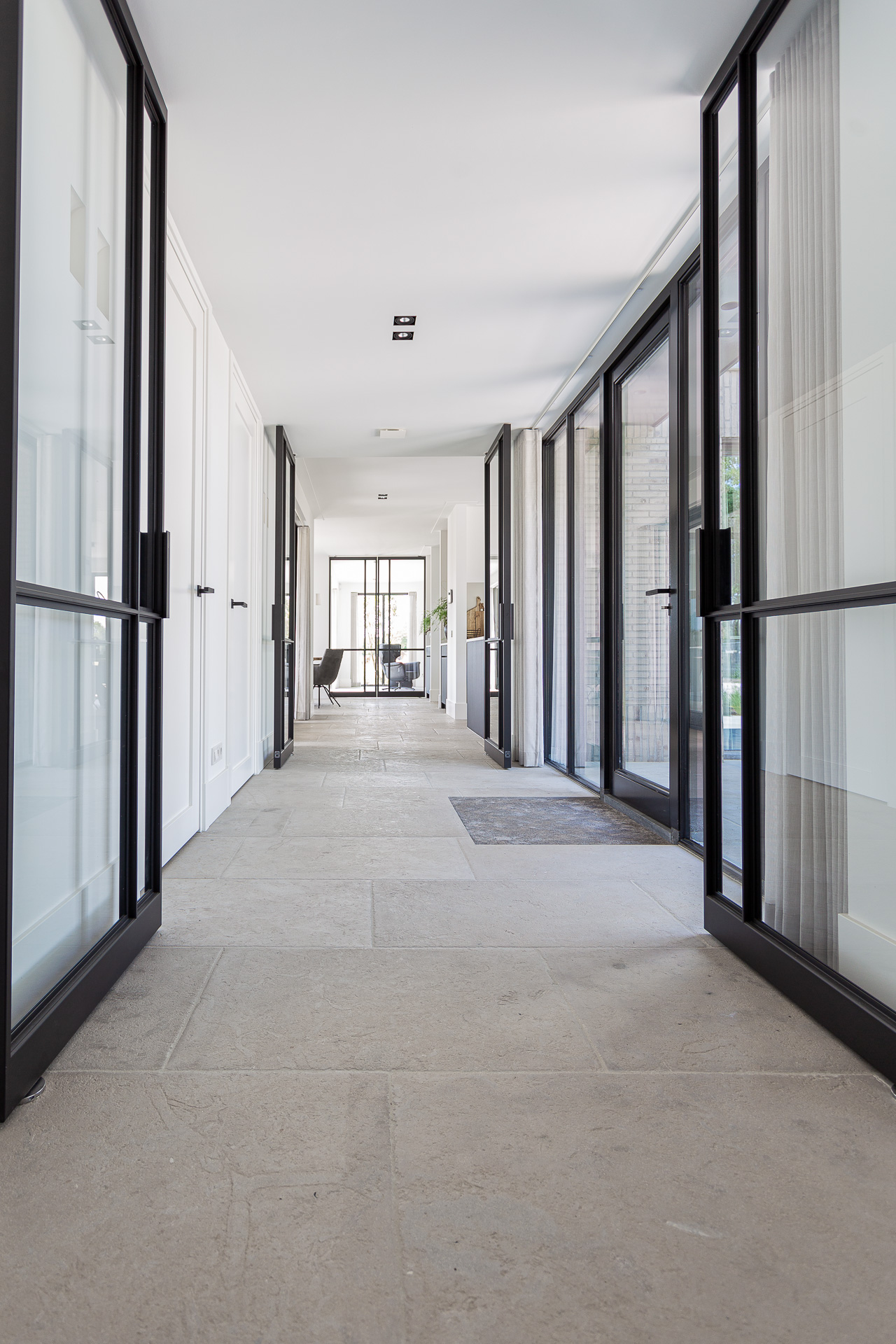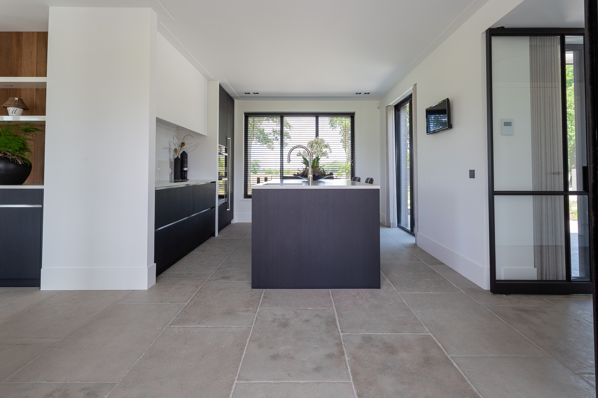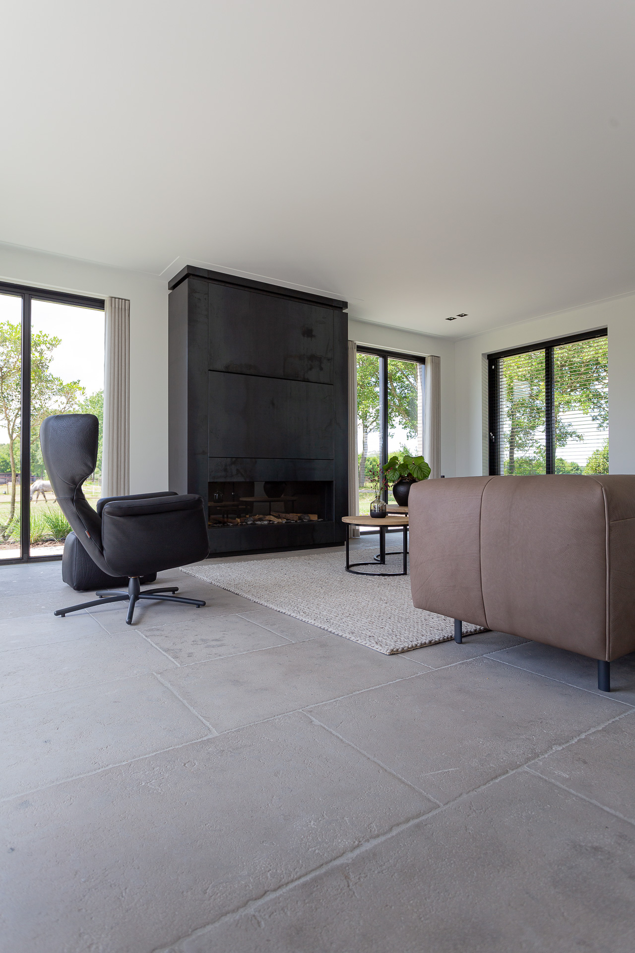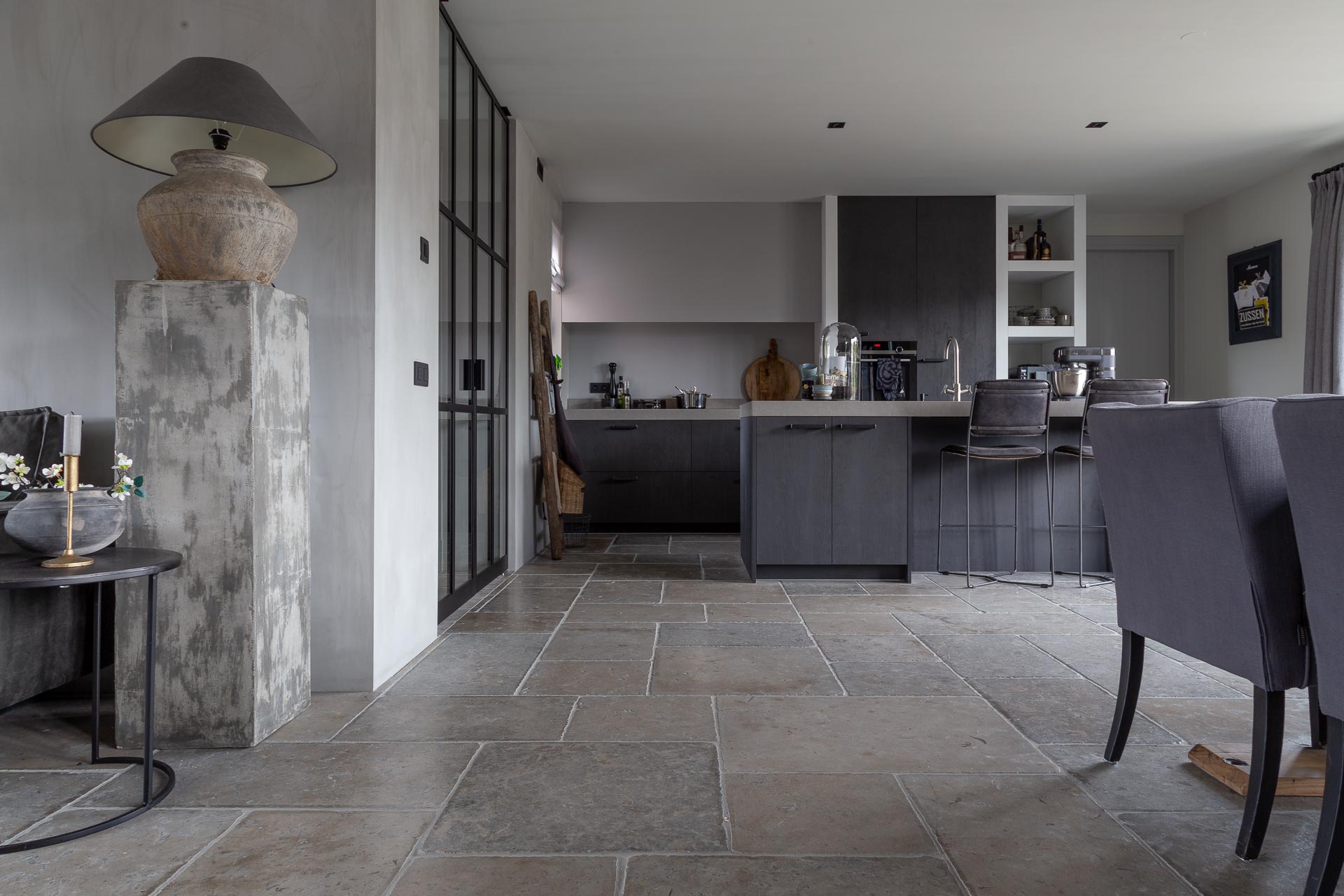 De natuursteen vloer zoals op de foto is handbewerkt met een gezandstraald en geborsteld oppervlak met licht verouderde randen. Na het plaatsen wordt de vloer voorzien van een beschermlaag, dat zorgt voor meer onderhoudsgemak.