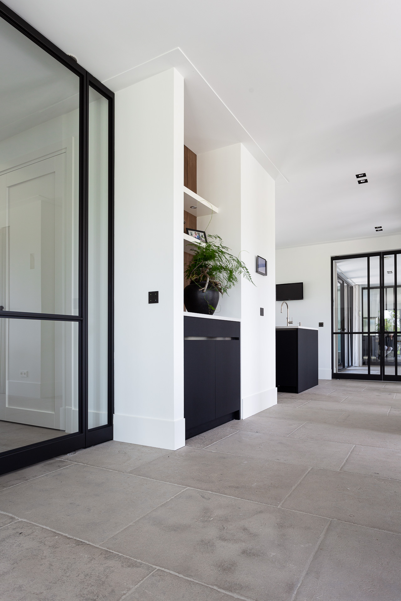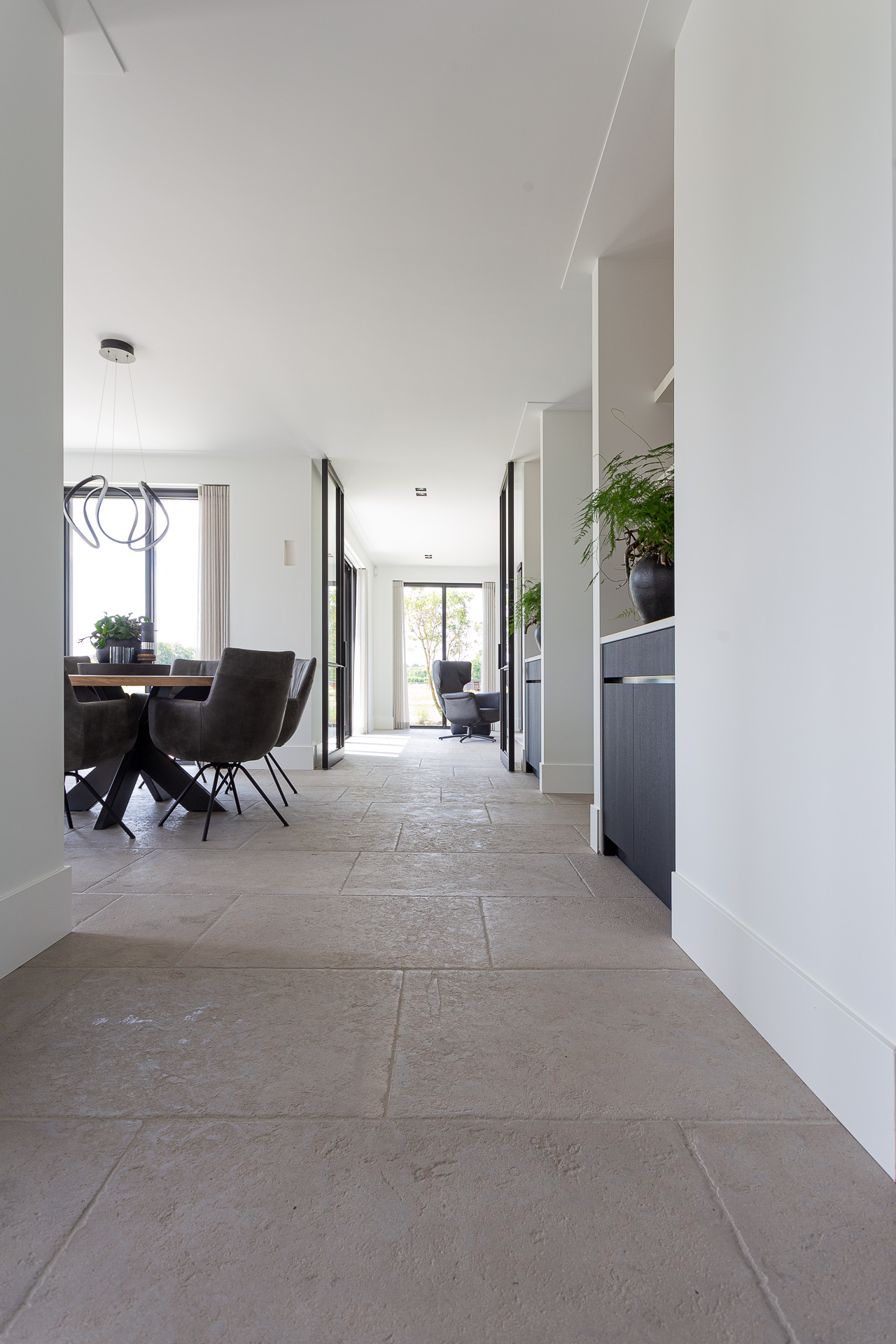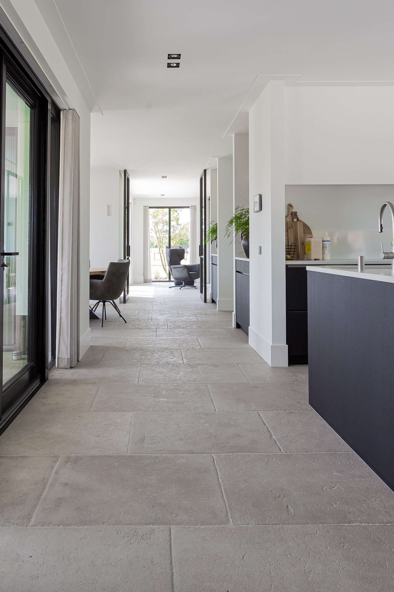 Een natuursteen vloer in zacht beige-grijstinten die toepasbaar is in vrijwel elke interieurstijl.