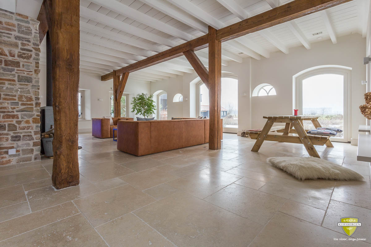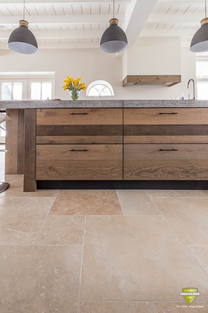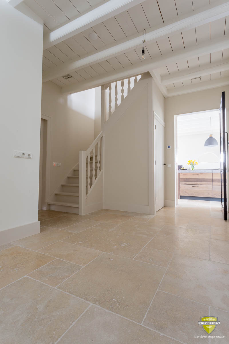 De vloertegels op deze afbeeldingen is getrommeld travertin dat is geselecteerd op kleur en structuur. Zo ontstaat er een rustig kleurenpalet van lichte beige tinten die in een wild verband is geplaatst. Vanwege het licht verouderde oppervlak, is het een vloer waar weinig op te zien valt, dus een gemakkelijke vloer in onderhoud.