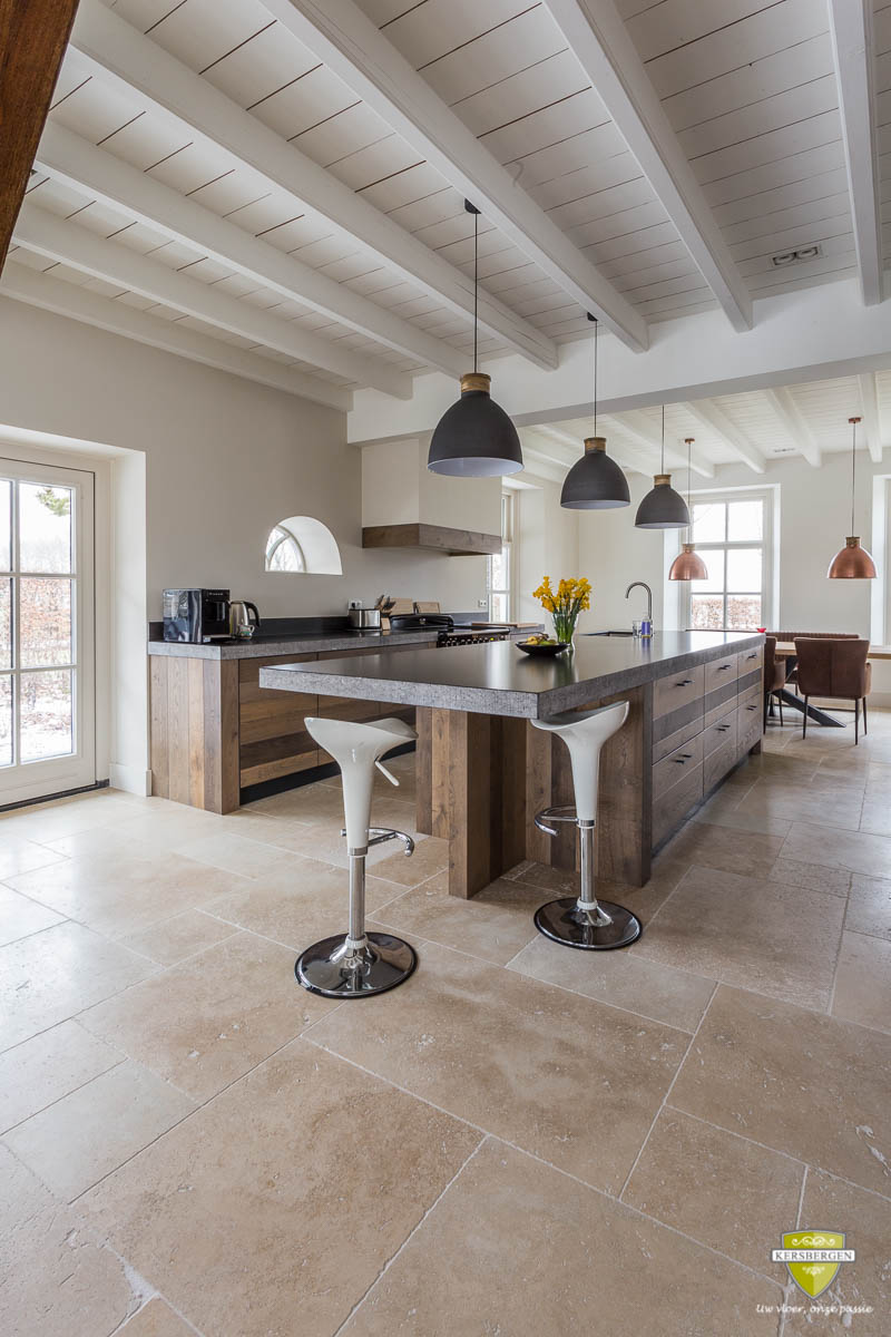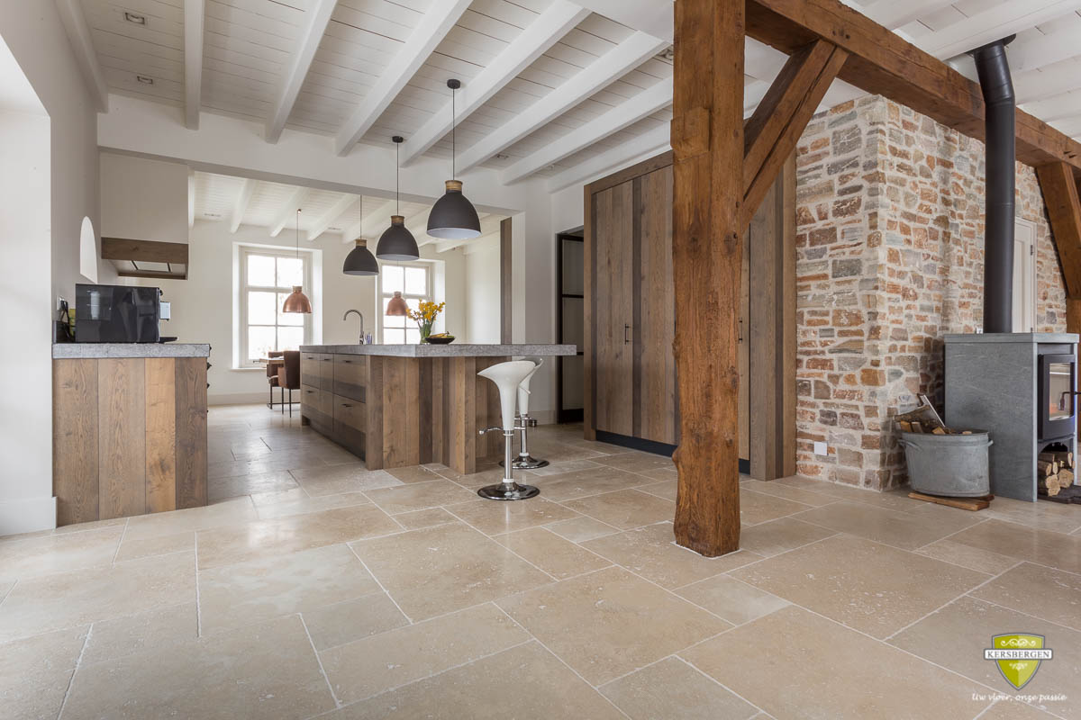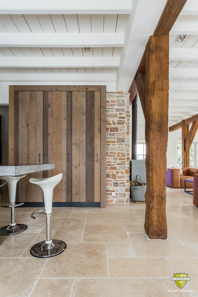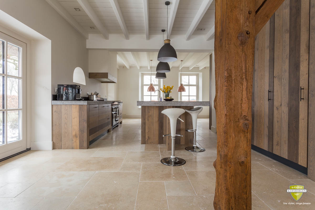De vloertegels op deze afbeeldingen is getrommeld travertin dat is geselecteerd op kleur en structuur. Zo ontstaat er een rustig kleurenpalet van lichte beige tinten die in een wild verband is geplaatst. Vanwege het licht verouderde oppervlak, is het een vloer waar weinig op te zien valt, dus een gemakkelijke vloer in onderhoud.