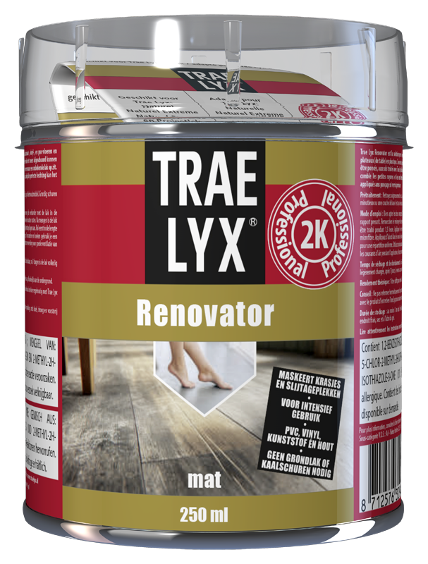 Met de Trae Lyx Renovator geef je je vloer of meubel een nieuwe kans. Deze matte, 2-componenten renovatielak breng je direct over de bestaande laag aan. Het grote voordeel: je hoeft de vloer niet volledig kaal te schuren. Licht opschuren is genoeg om de nieuwe lak goed te laten hechten. Zo bespaar je enorm veel tijd en werk.