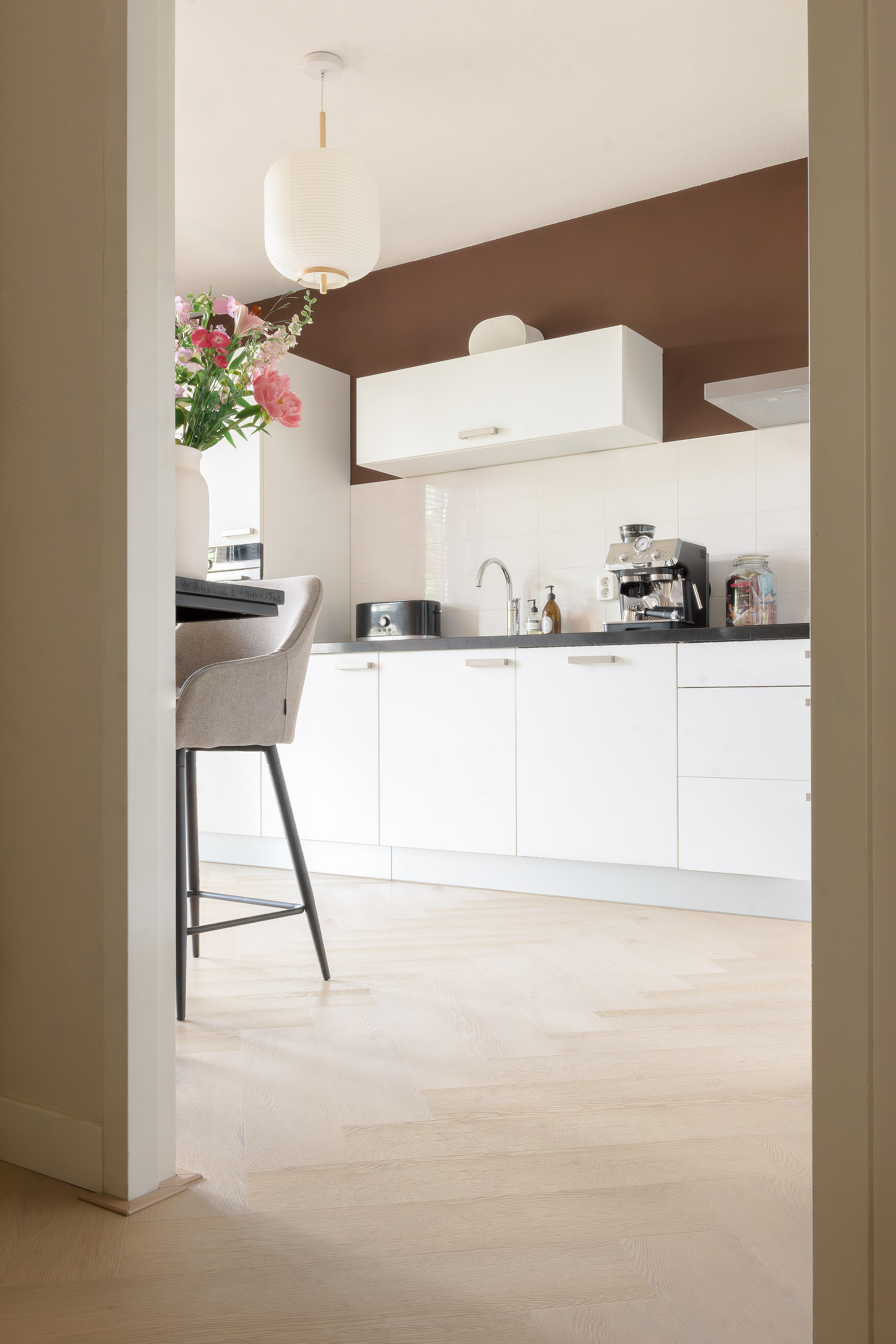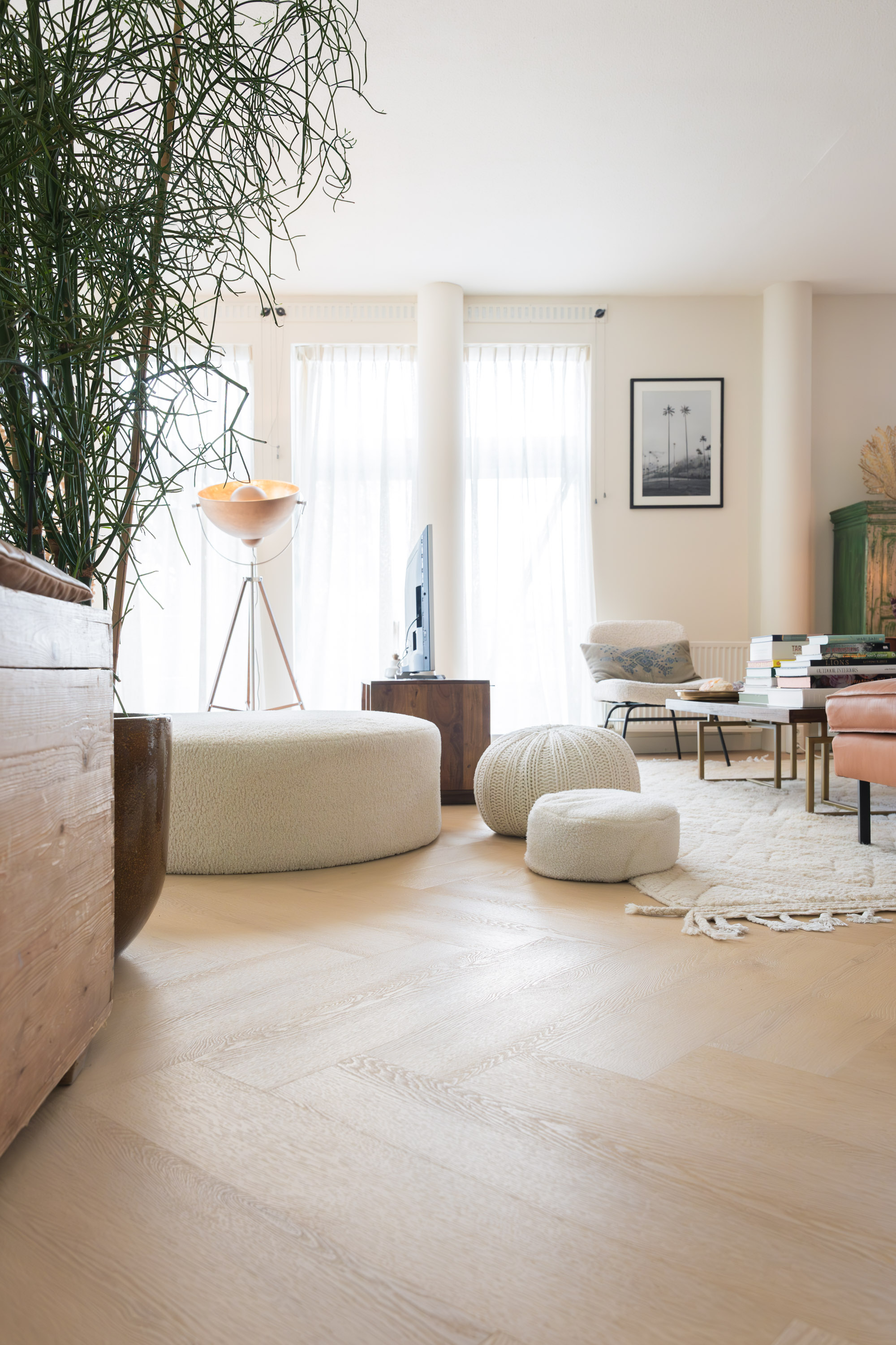 In deze prachtige woning in Amsterdam komt de Belakos Palazzo visgraat XL in kleur 77 prachtig tot zijn recht. De warme kleur en het rustige design van deze visgraatvloer zorgen voor een fijne basis van de rest van de woning.