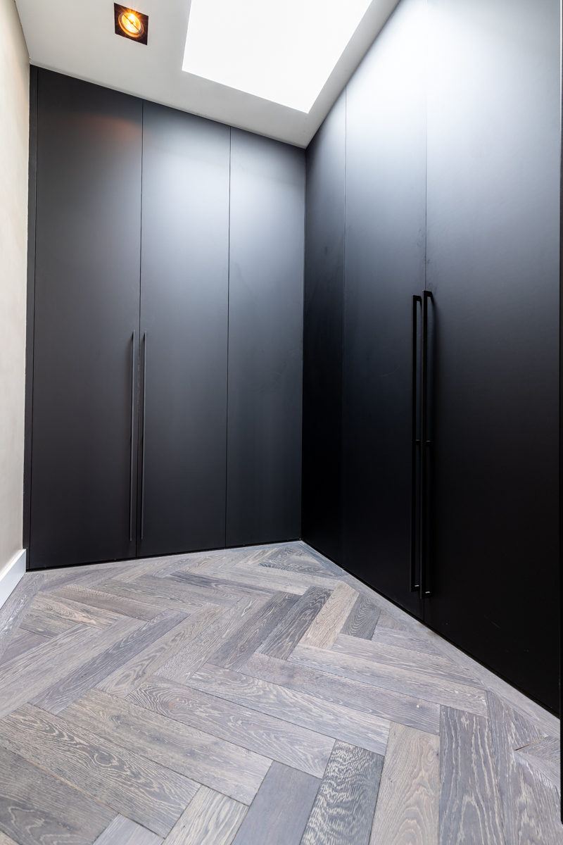 Een wens die wij steeds vaker mogen vervullen, het plaatsen van een visgraat vloer in een stoere donkere kleur!