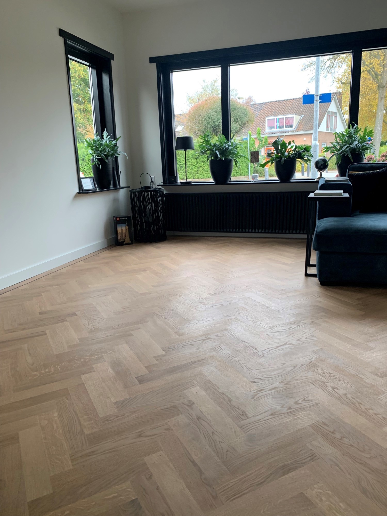 We hebben bij een tevreden klant deze mooie visgraat lamelparket vloer met band en bies mogen verzorgen.