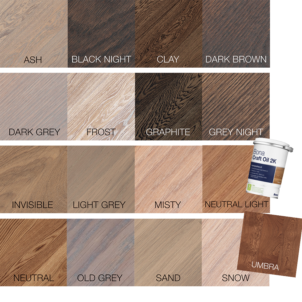 Met de Bona Parketolie kan je kiezen uit 17 standaardkleuren – de kleuren zijn ook nog eens onderling mengbaar waardoor er eindeloos kleuren ontstaan.