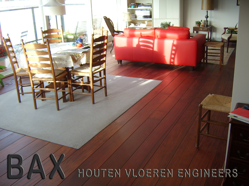 Een Jatoba houten vloer in de long life lamelparket variant. Een jatoba houten toplaag van 4mm is watervast verlijmd op 15mm multiplex. De vloer is afgewerkt met een naturel olie en daarmee zeer makkelijk in onderhoud.
