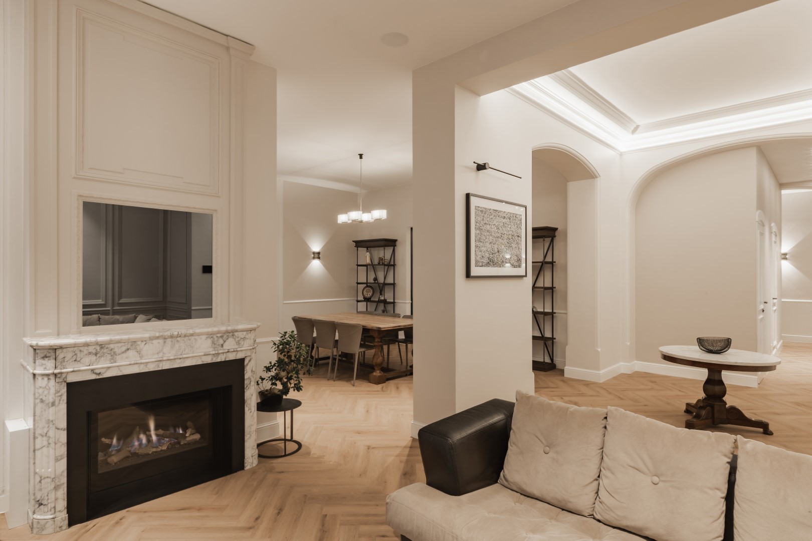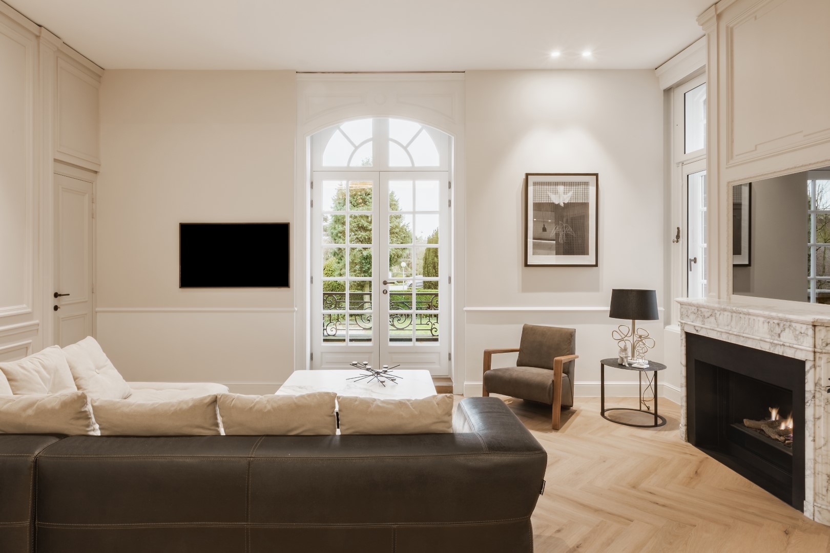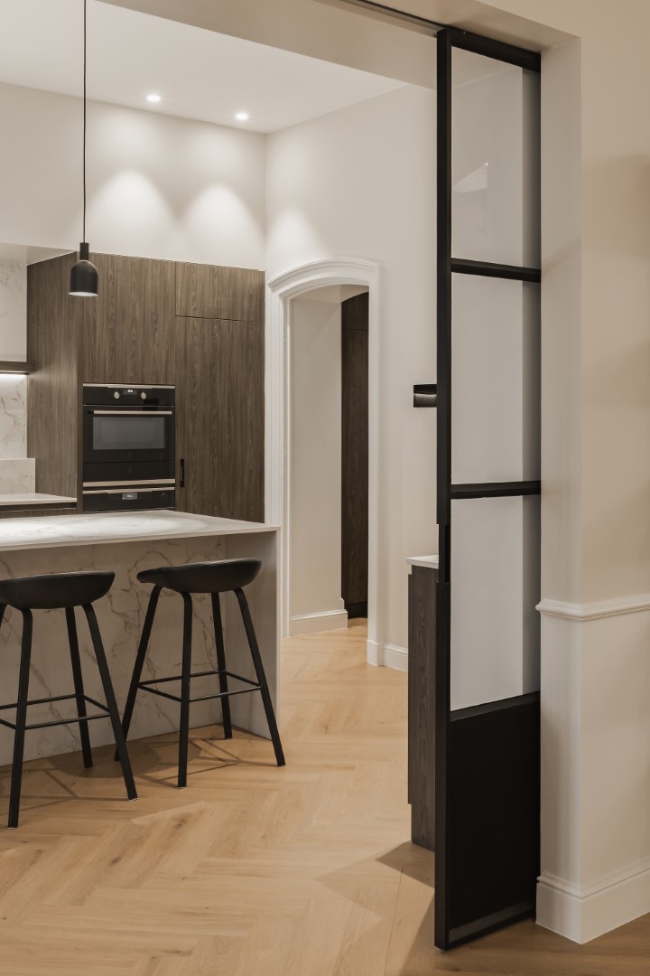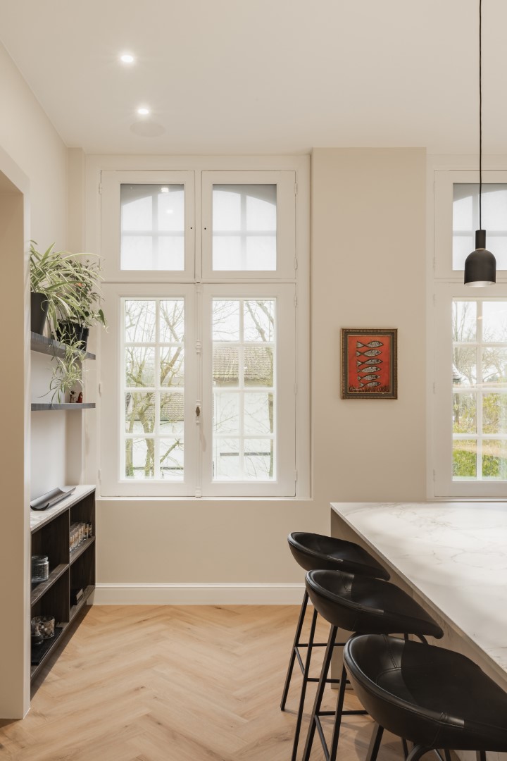 De gedurfde knopen en kleurschakeringen van de Parquetvinyl Mantaro geven deze PVC-vloer een natuurlijke en realistische look. Het visgraatmotief voegt een elegante finesse toe. (Foto: Bert Demasure)