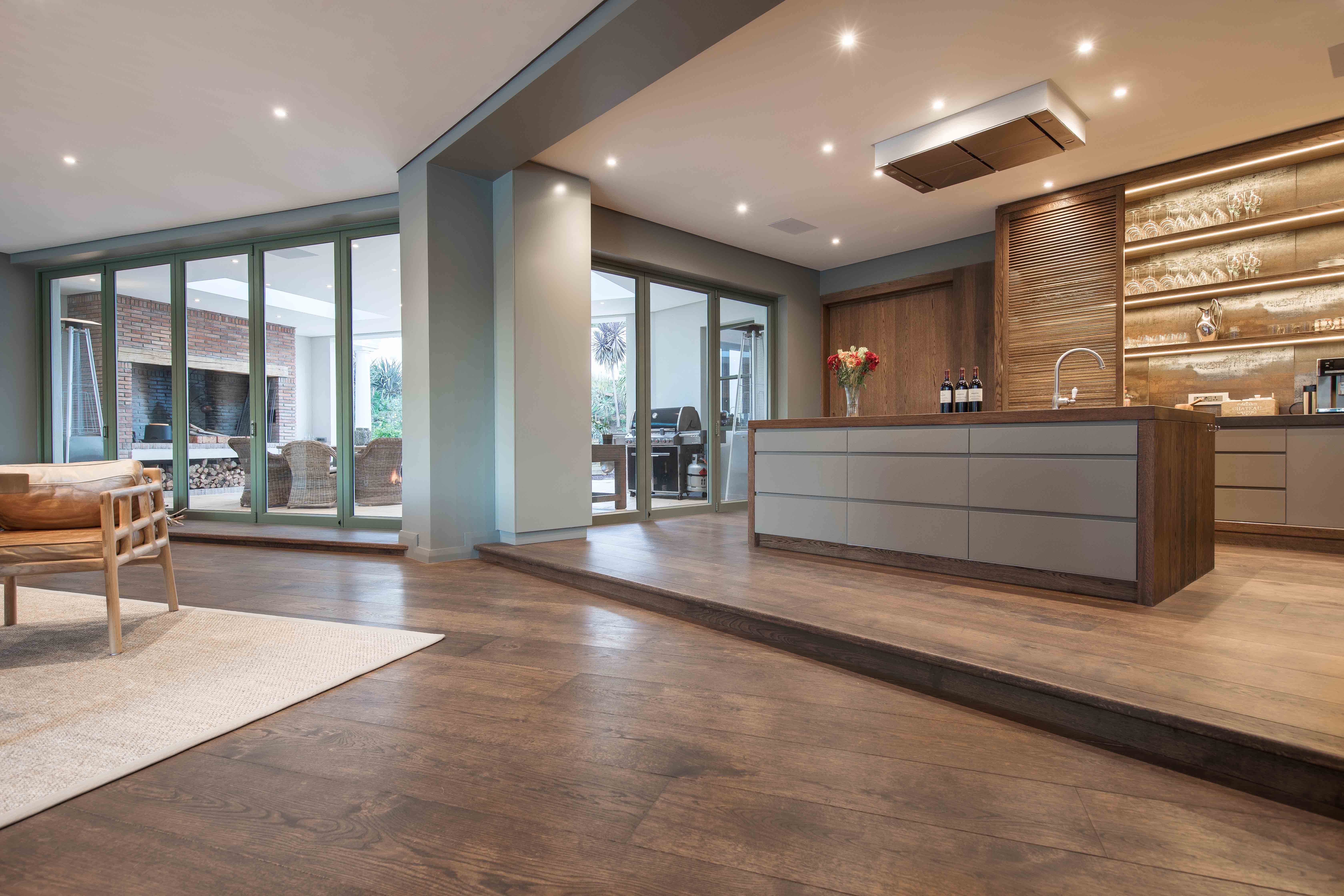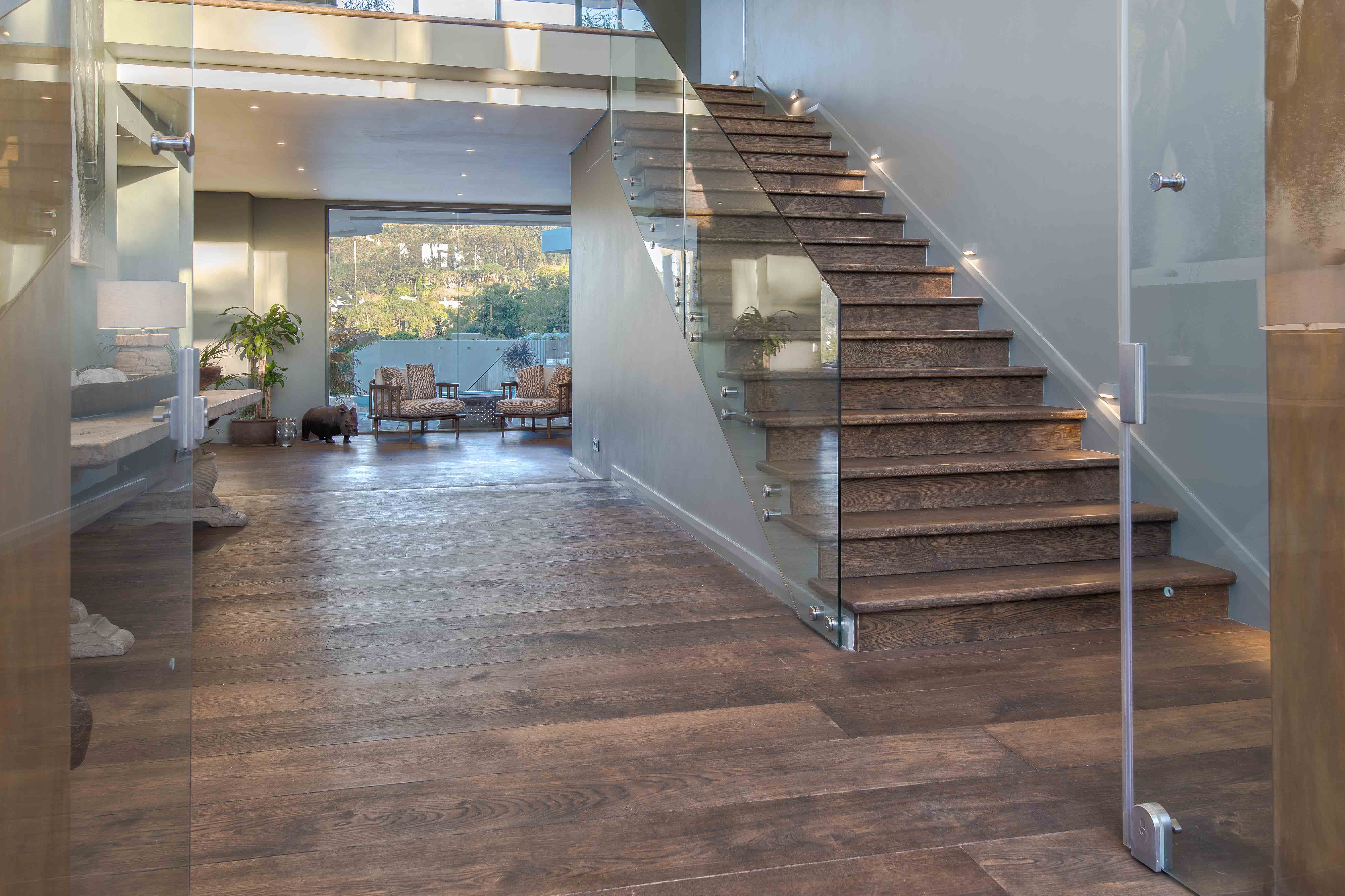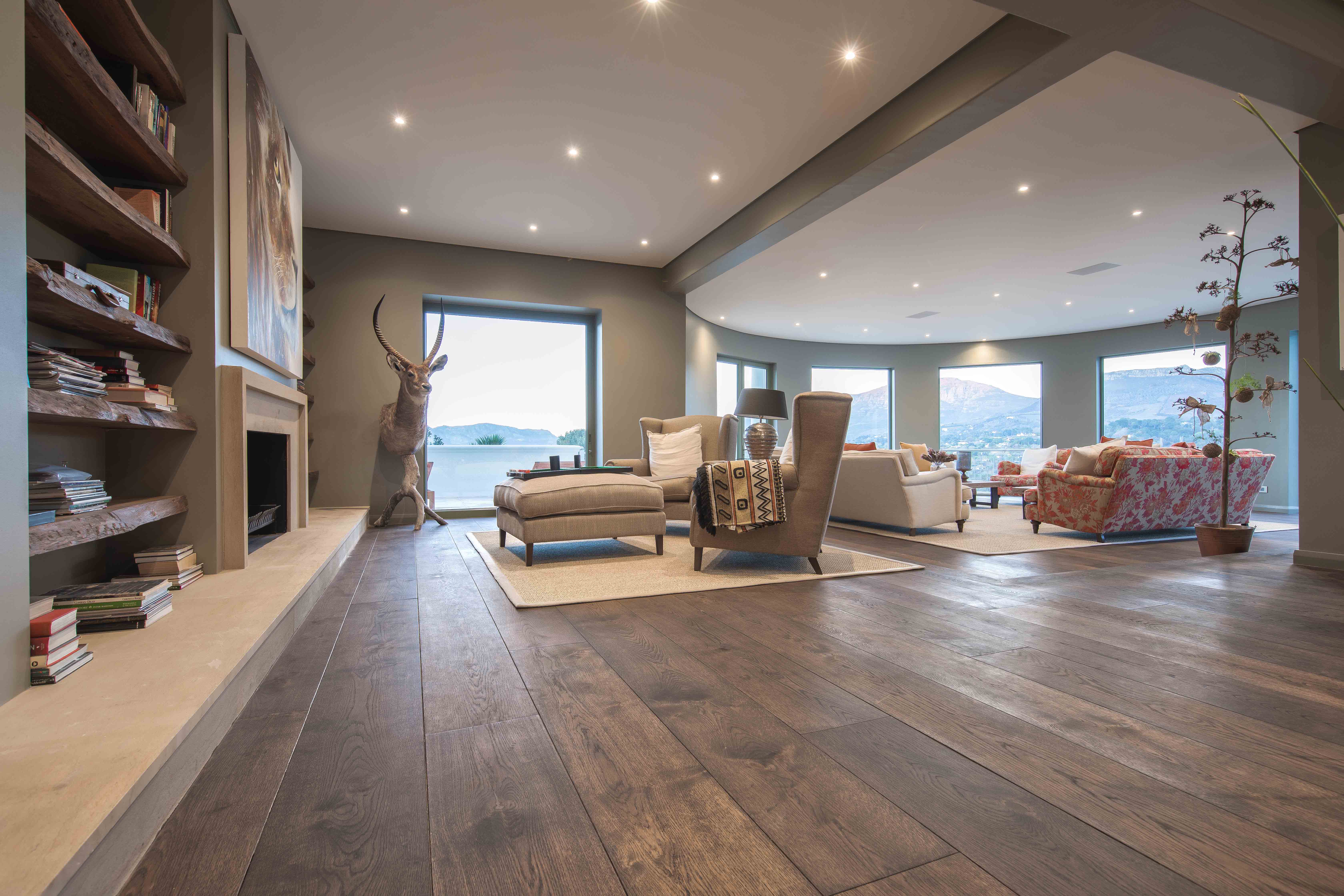 In een prachtige villa in Zuid-Afrika is een 3-laags massieve Cinzento Custom Made® eiken vloer gelegd. De vloer komt goed tot zijn recht in de grote open ruimtes van deze woning. De klant heeft namelijk gekozen voor 300 mm brede planken. De massieve eiken planken kunnen geleverd worden tot wel 3 meter lang. Omdat de vloer bruin geolied is geeft dit een natuurlijke uitstraling in combinatie met het interieur.