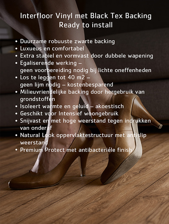 Deze zwarte compacte backing met dubbele wapening is extra stabiel en vormvast wat resulteert in een zeer luxueus en comfortabel vinyl. Daarbij zorgt Black Tex Backing voor een betere warmte isolatie en draagt bij aan een verbeterde akoestiek. De geluiddempende werking maakt dat uw interieur stiller wordt en vermindert contactgeluid - naar bijvoorbeeld benedenburen - aanzienlijk.