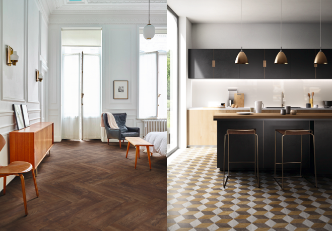 Uit trendonderzoek is gebleken dat er een trend te signaleren valt waarbij de architectonische gegevens van een huis leidend zijn bij de inrichting en aankleding van de ruimte. De tuinkamer en keuken mag weer worden afgesloten, niet met kleine gesloten deuren maar mooie industriële glazen en stalen deuren. Ook kamers ensuite worden weer in ere hersteld. Deze verschillende ruimtes nodigen uit om ook voor verschillende vloerbekledingen te kiezen. Met de collectie pvc vloeren van Moduleo kunnen de vloeren perfect op elkaar worden afgestemd en tegelijk een hele verschillende look en uitstraling creëren.
